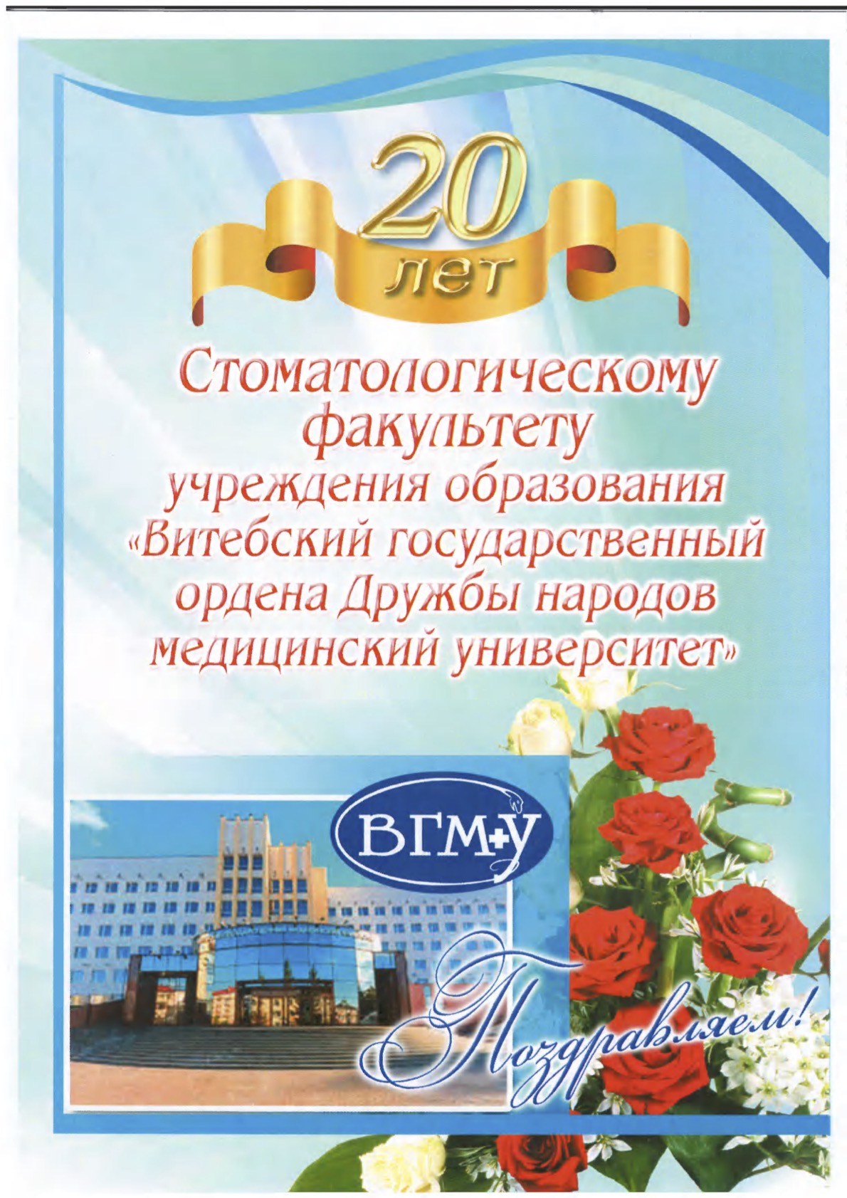 Ректорат Белорусского государственного медицинского университета, профессорско-преподавательский состав стоматологического факультета горячо и сердечно поздравляет Вас и замечательный коллектив стоматологического факультета учреждения образования «Витебский государственный ордена Дружбы народов медицинский университет» с 20-летием со дня основания!