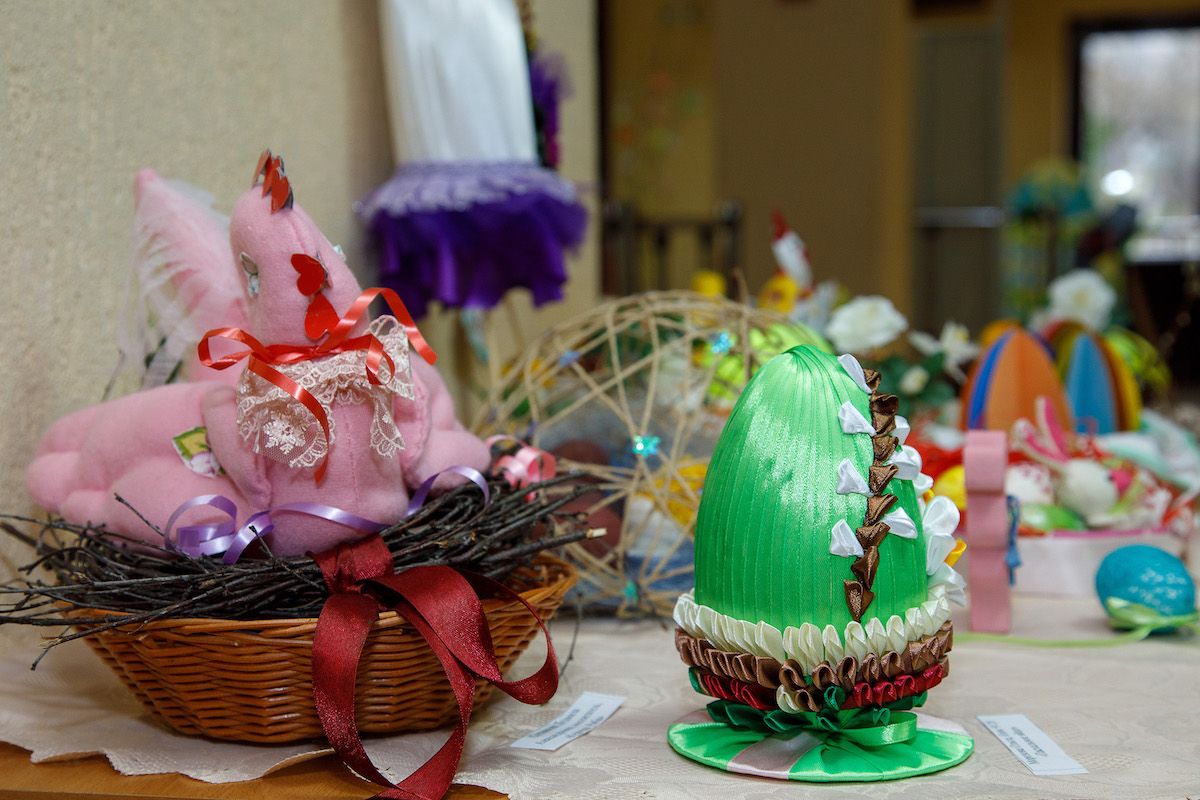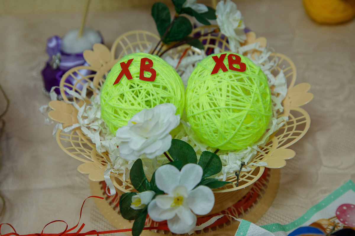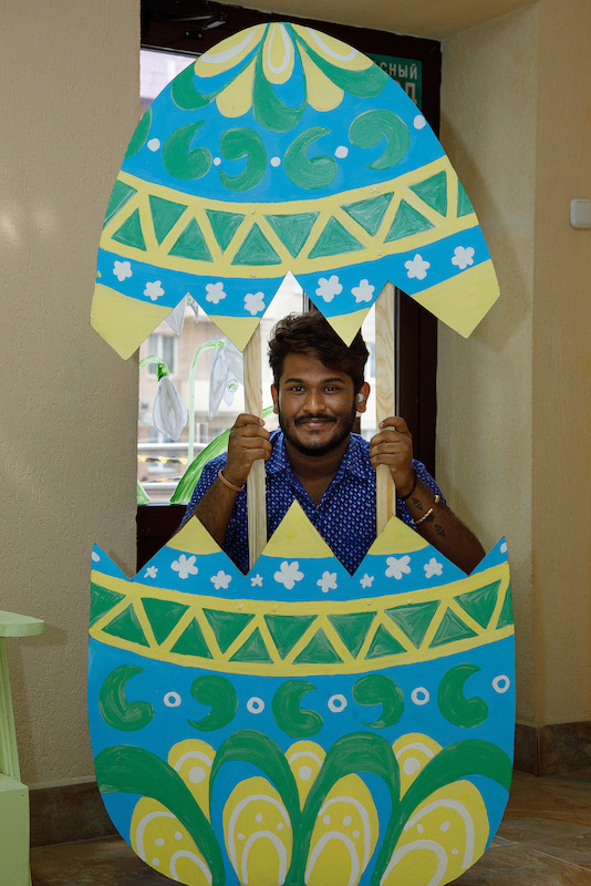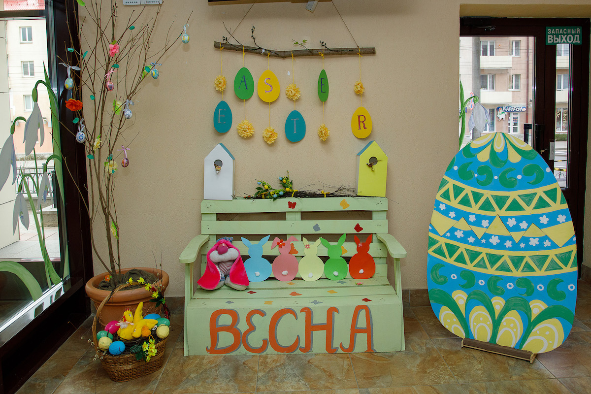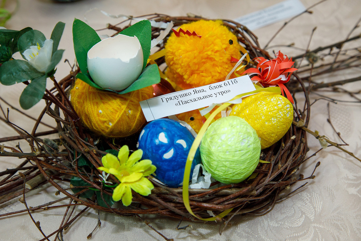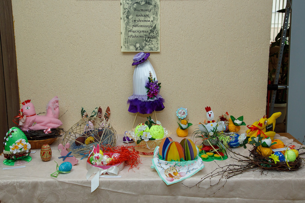 Символ праздника – пасхальное расписное яйцо более метра высотой встречает каждого входящего в общежитии №7. На выставке работ студентов и сотрудников, а также в фотозоне общежития огромное количество разноцветных пасхальных яиц, сделанных из разных материалов: из дерева, из ткани, из папье-маше.