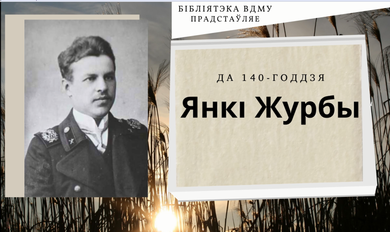 Бібліятэка ВДМУ прадстаўляе прэзентацыю, прысвечаную 140-годдзю з дня нараджэння нашага славутага земляка, беларускага пісьменніка, паэта, публіцыста Янкі Журбы. Сардэчная адкрытасць і шчырасць пачуцця, нязгасальны аптымізм Янкі Журбы ў новым гучанні вершаў.