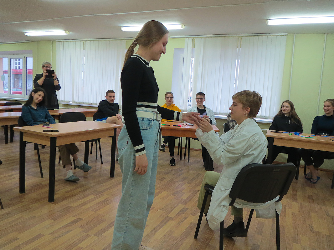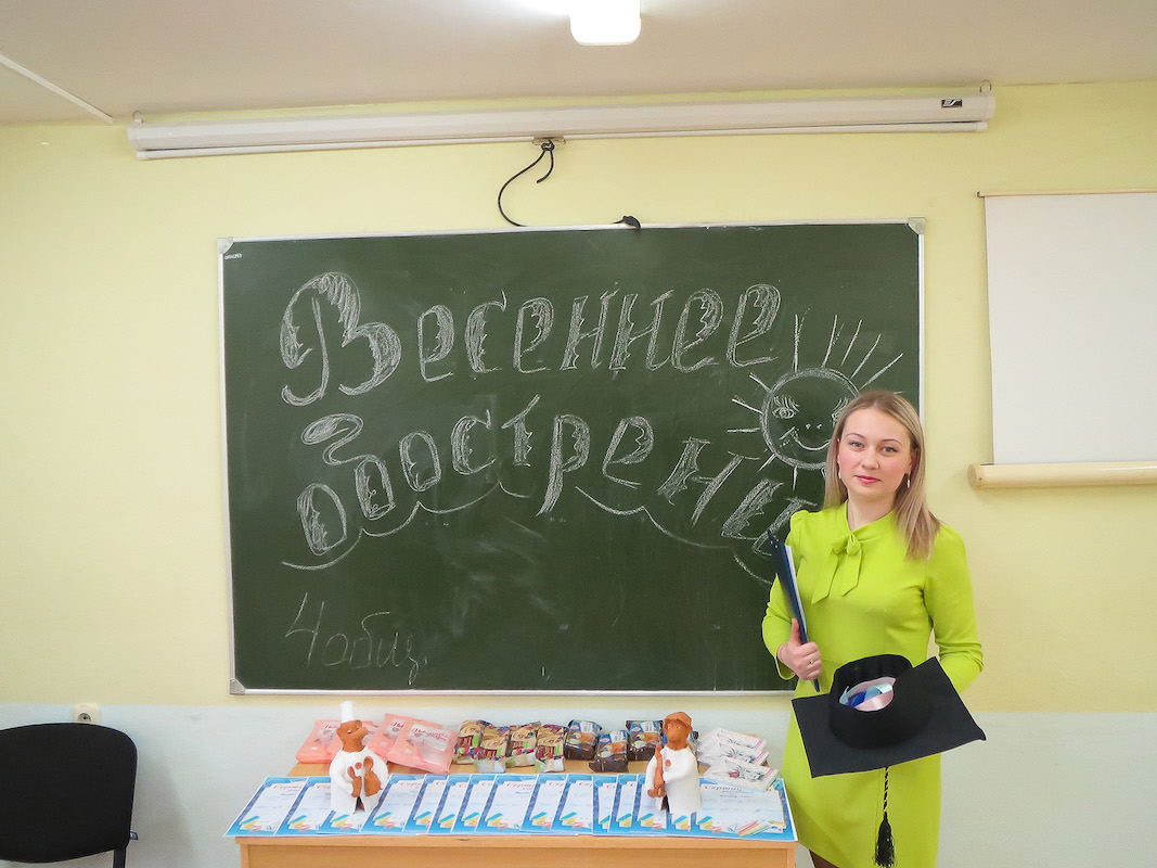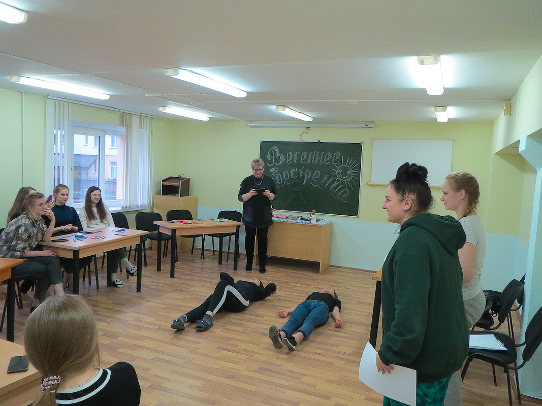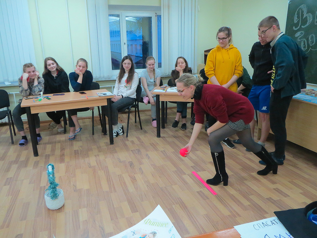И, конечно же, не обошлось без минутки спорта под названием «Вижу цель – иду к ней». Студенты должны были с небольшого расстояния попасть мячом в корзинку, стоявшую в нескольких метрах от них. У кого-то получилось не сразу, однако все весело провели время и получили возможность поработать над своей ловкостью. Все участники конкурса были вознаграждены сладкими призами и хорошим весенним настроением. И никто не ушёл без улыбки на лице.