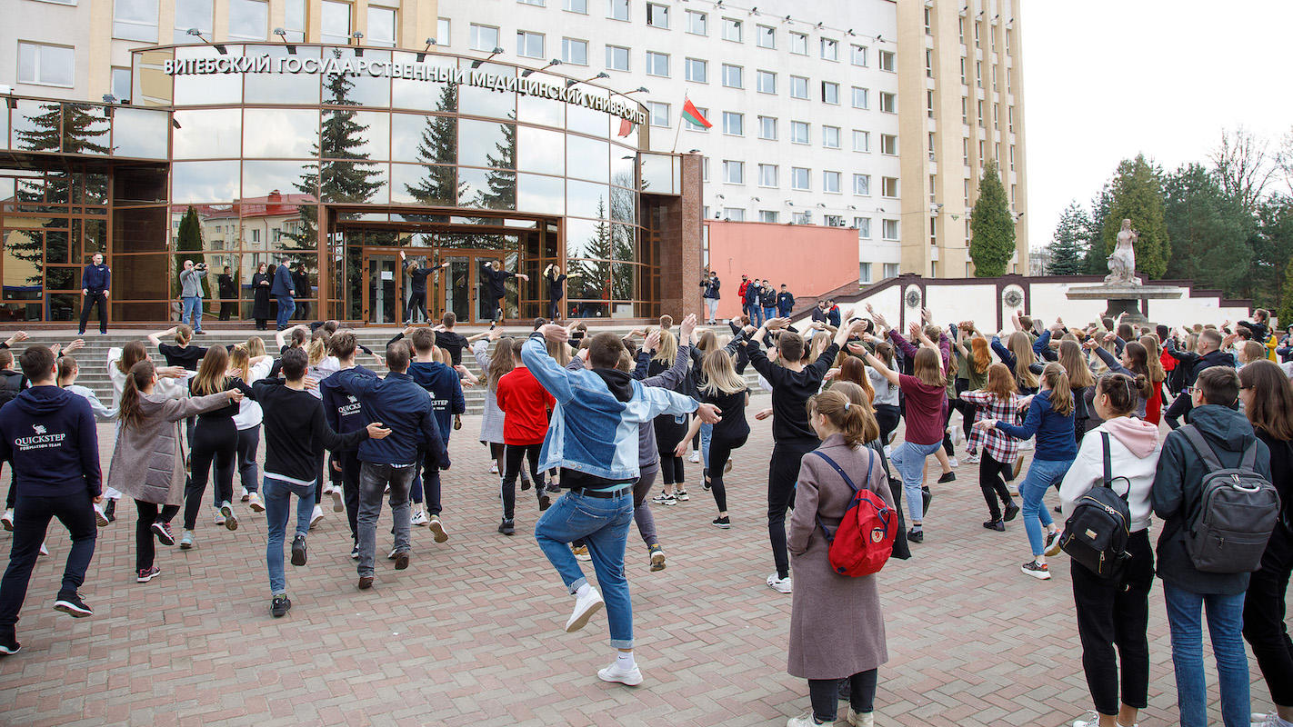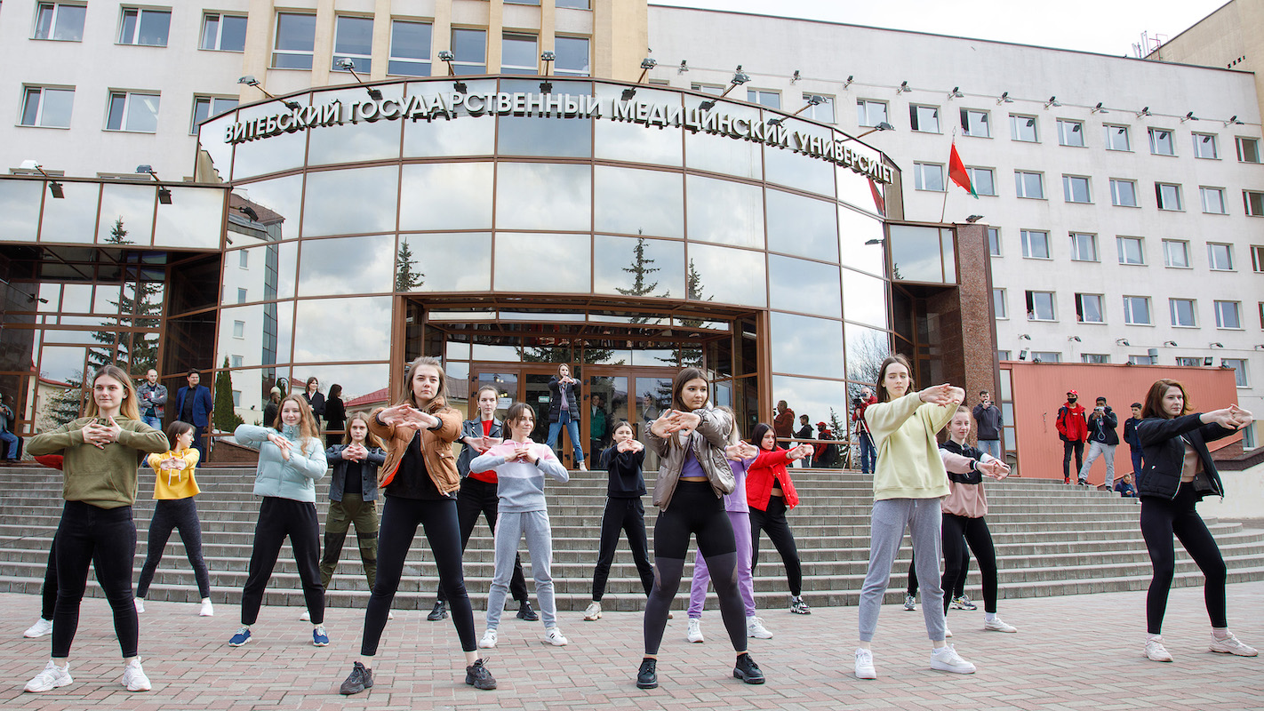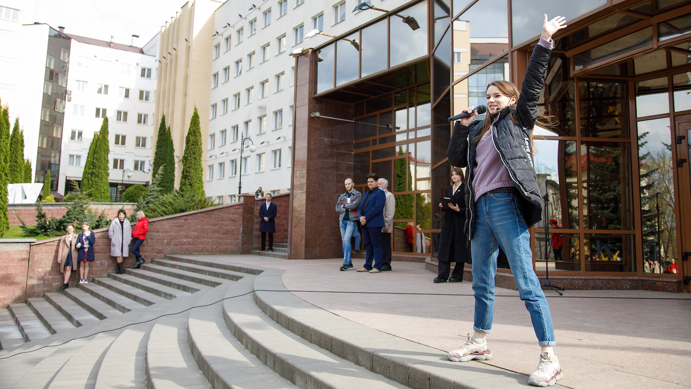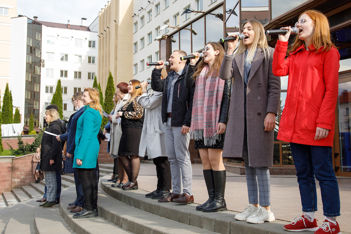 После танцевального флэш-моба собравшиеся на площади ВГМУ вместе спели гимн нашего университета.