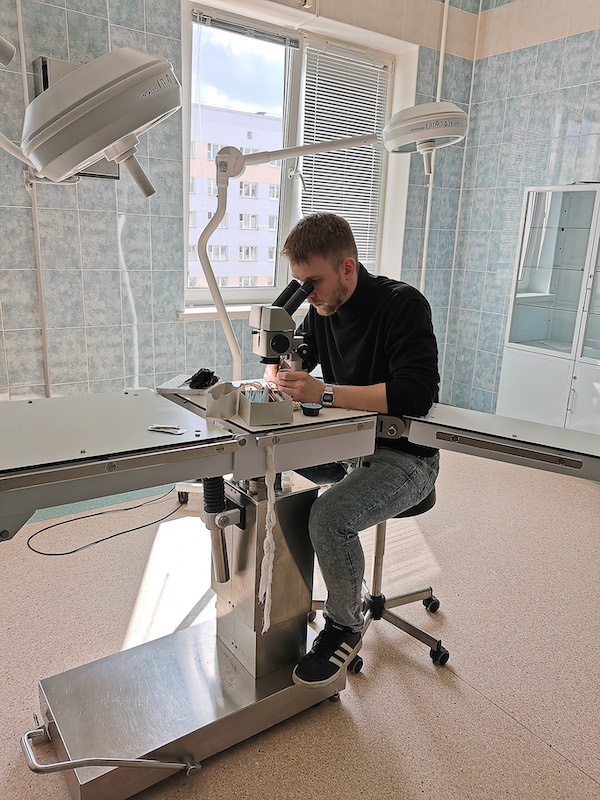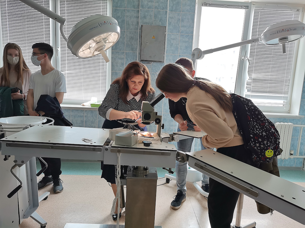 Во время экскурсии гимназисты увидели, как студенты тренируются накладывать швы, вязать узлы, оттачивают мастерство микрохирургических манипуляций. Всем слушателям была дана возможность прикоснуться к обучению и самим рассмотреть под микроскопом новейшую и практически незаметную хирургическую нить.