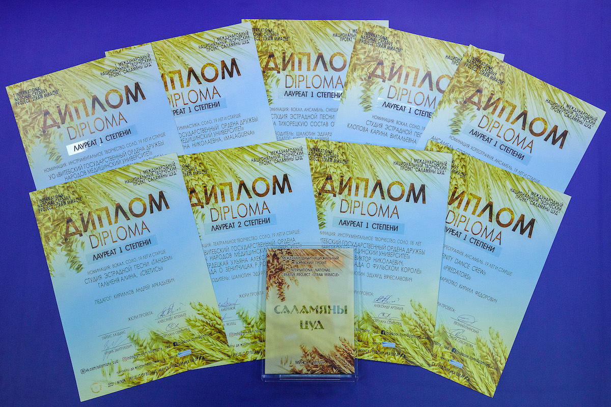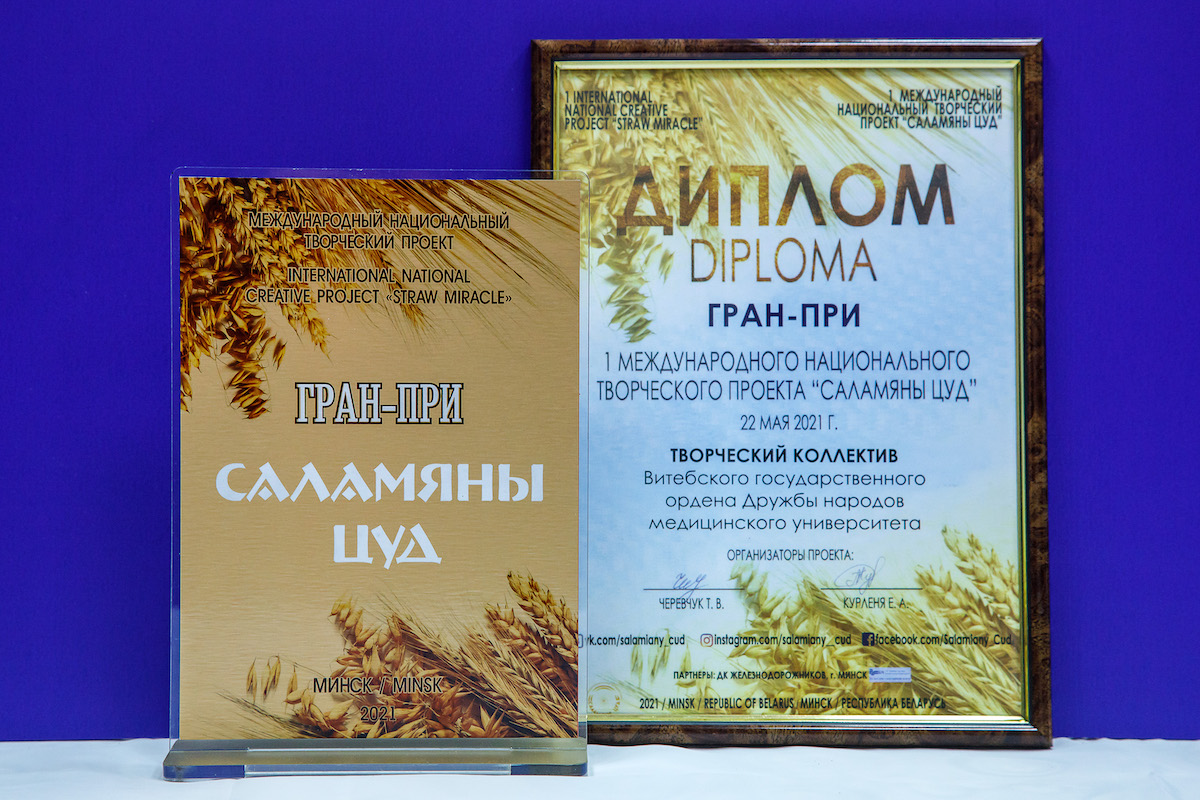 22 мая 2021 года в г.Минске состоялся I Международный национальный многожанровый творческий проект «Саламяны цуд» - около 700 участников в 9 номинациях, 6 сменяющихся составов жюри, 167 творческих номеров, 12 часов подряд в режиме non-stop. Наш университет был представлен 44 участниками в 7 номинациях. Результат превзошёл все самые смелые ожидания: дипломы I степени – ансамбль спортивного бального танца «Квикстеп», «INFINITY DANCE GROUP», студия эстрадной песни «Тандем», Карина Клопова (вокал, соло), Алина Гальченя (вокал, соло, авторская песня), Арина Чернякова (гимнастика, соло), Дмитрий Лукьянов (баян), Виктор Стефаненко (фортепиано). Диплом II степени – Ульяна Жердецкая (художественное слово, I степень не присуждалась). И, наконец, главная награда всего проекта – Гран-при «Лучший творческий коллектив» единогласным решением жюри и организаторов присуждена творческому коллективу Витебского государственного ордена Дружбы народов медицинского университета! ВГМУ – лучший!