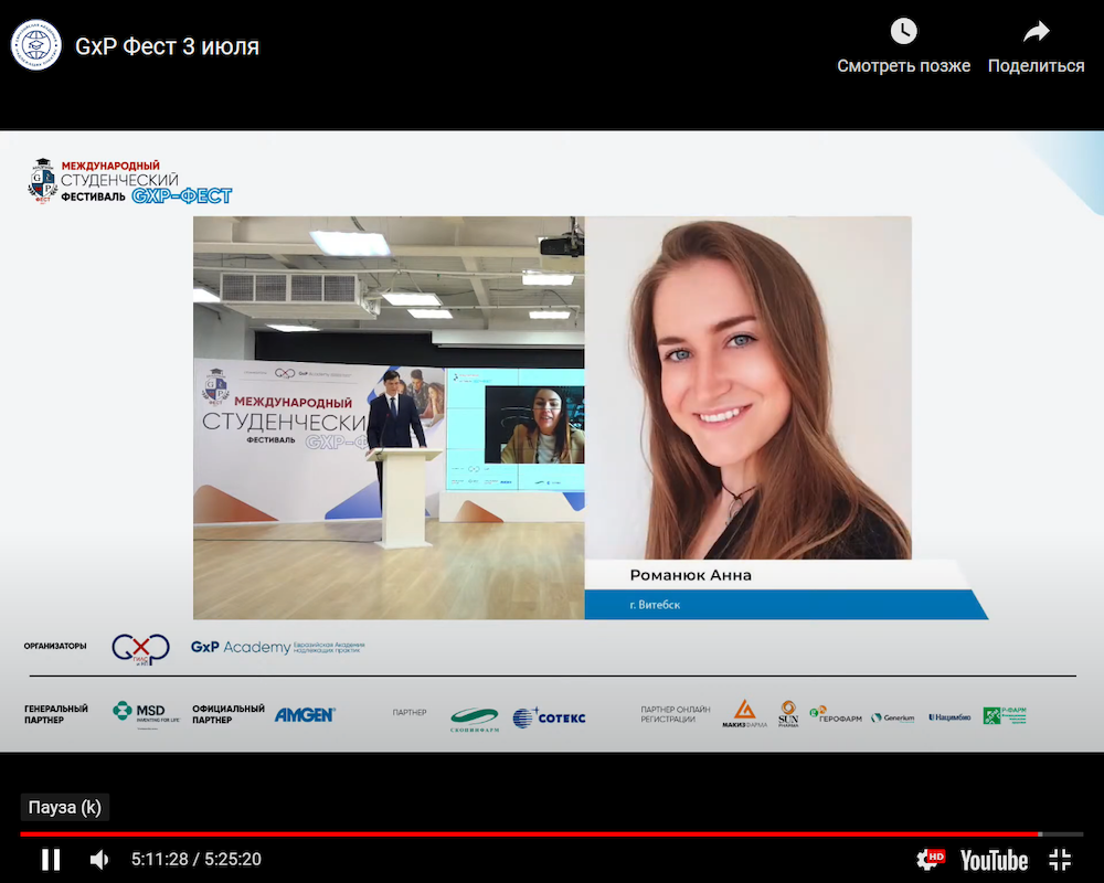 В рамках GxP-Феста была организована фармацевтическая викторина от компании MSD Pharmaceuticals, в которой Романюк А.А. заняла 3 место.