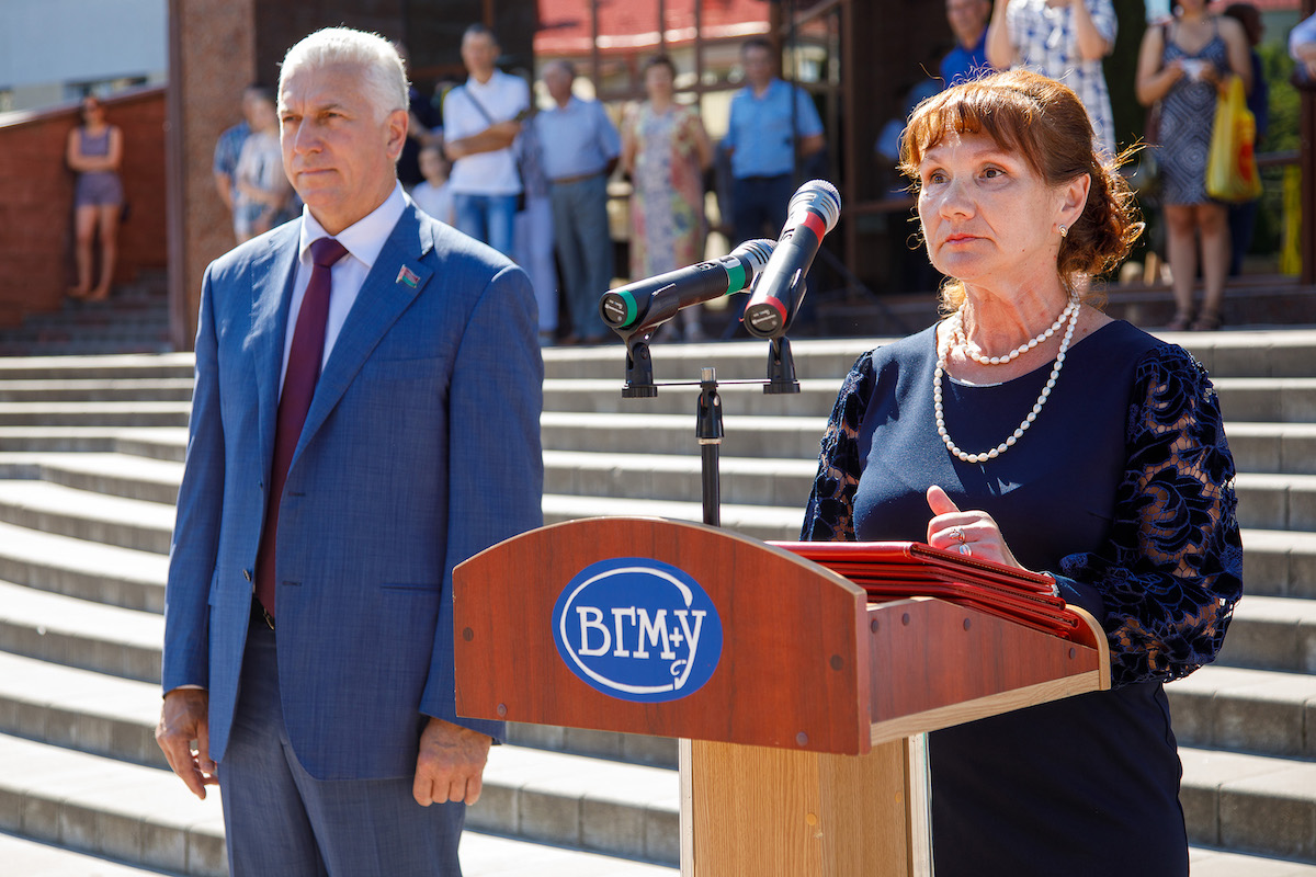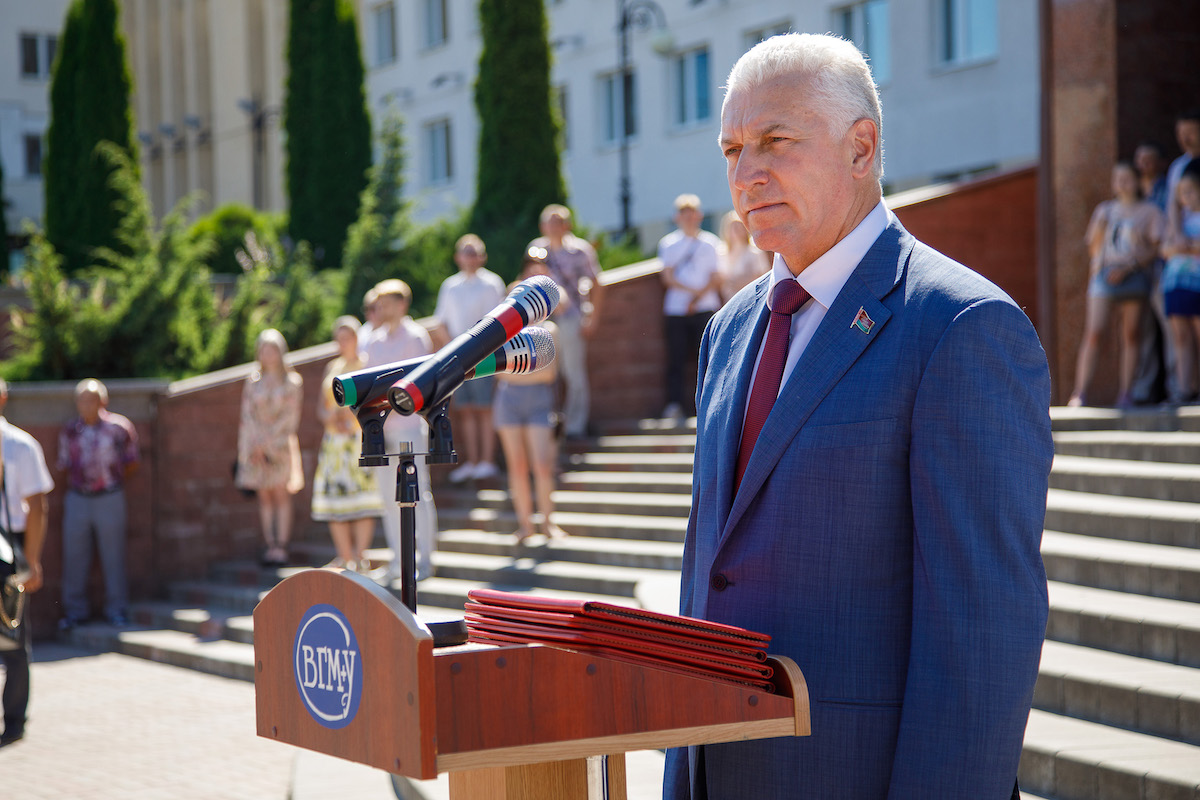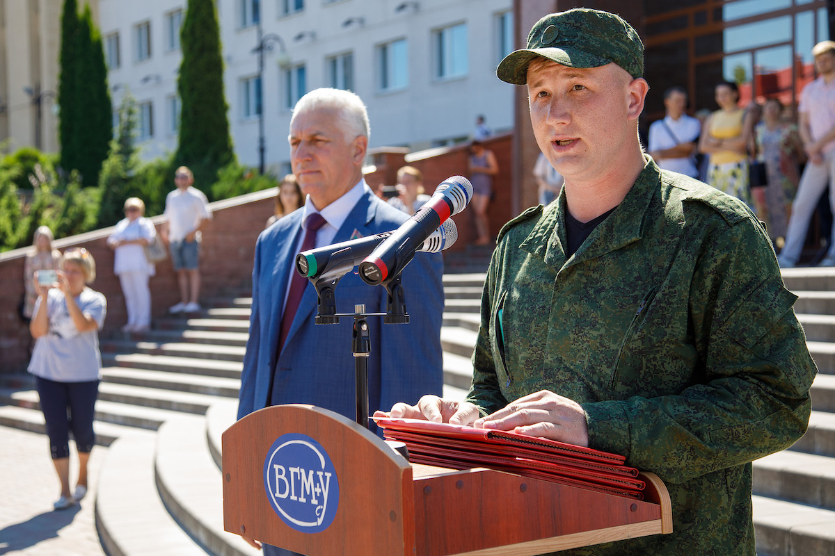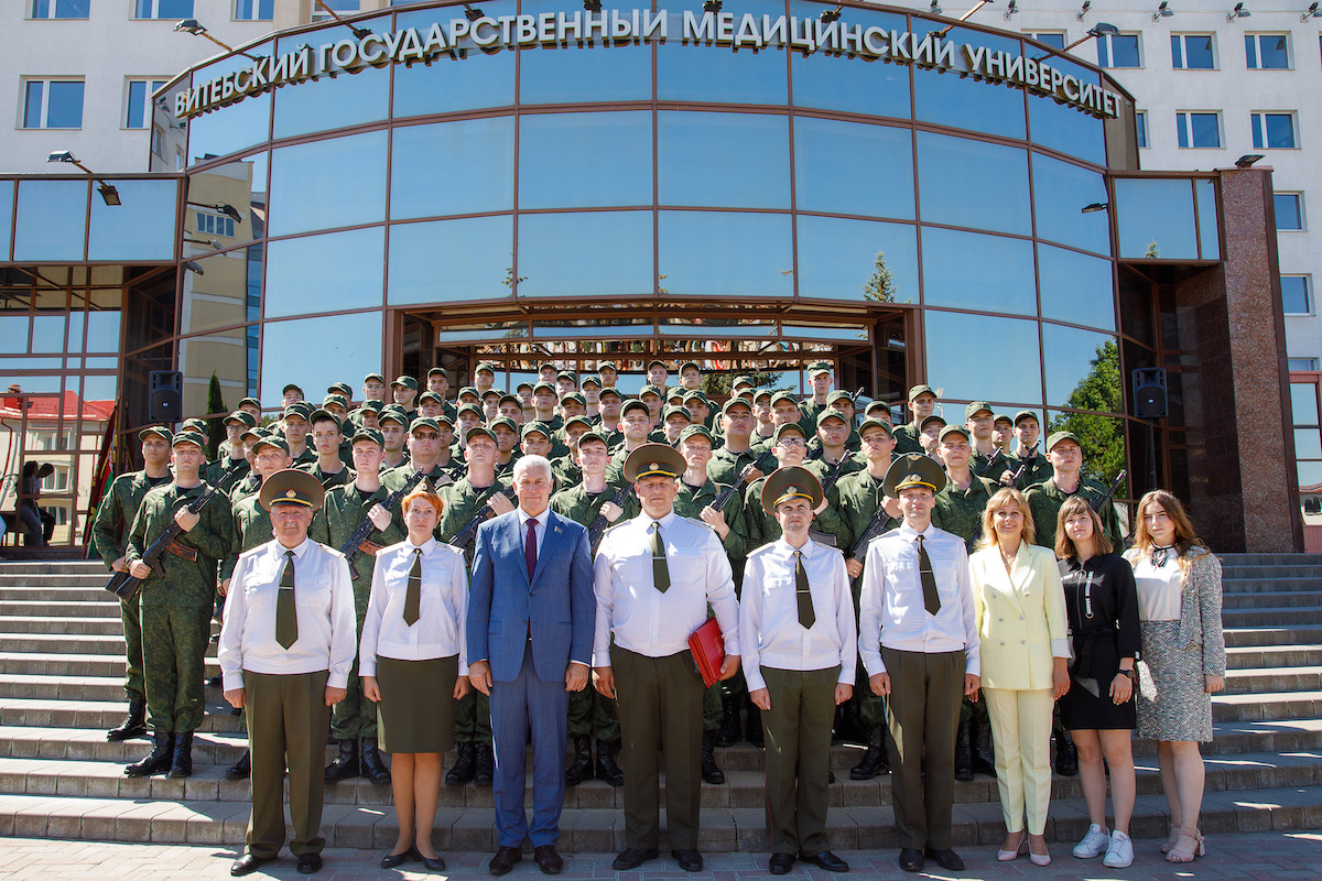 Затем состоялся митинг, на котором с приветственным словом к студентам, принявшим присягу на верность своей Родине и народу Республики Беларусь обратился ректор учреждения образования «Витебский государственный ордена Дружбы народов медицинский университет» профессор Анатолий Тадеушевич Щастный. Много добрых напутственных слов было сказано выступившими на митинге матерью студента 4 курса лечебного факультета Ковалевской В.Я., активисткой общественного объединения Белорусский республиканский союз молодежи ВГМУ с правами районного комитета Гончаровой Т.В. В конце митинга выступил командир третьего учебного взвода Ковалевский А.А., который заверил руководство университета, профессорско-преподавательский состав кафедры военной подготовки и экстремальной медицины, родных и близких, что он и стоящие в строю его товарищи будут честно и добросовестно изучать преподаваемые им дисциплины, никогда не забудут клятву на верность Родине и народу, данную сегодня, будут достойными гражданами Республики Беларусь. «Я горжусь, что обучаюсь в нашем университете», — в заключении сказал Артем.