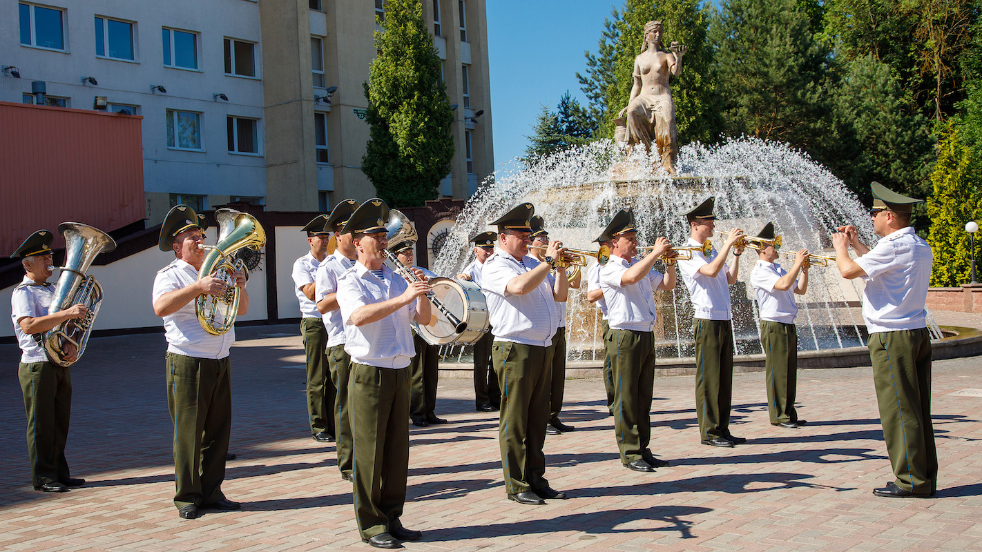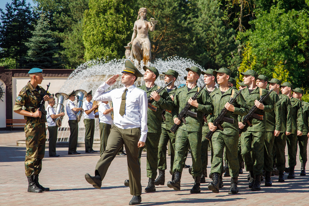 Под звуки военного оркестра студенты прошли торжественным маршем, а затем исполнили строевую песню.