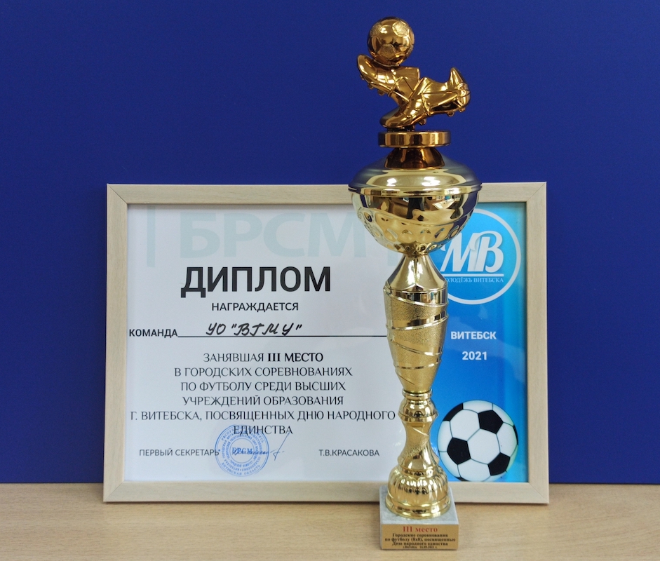16 сентября 2021 г. на спортивной базе ВГУ им. П.М. Машерова прошли соревнования по футболу с участием мужских команд учреждений высшего образования г.Витебска, посвящённые Дню народного единства. В результате захватывающей, напряжённой борьбы сборная команда ВГМУ заняла 3-е место, опередив команды ВГАВМ и МИТСО.