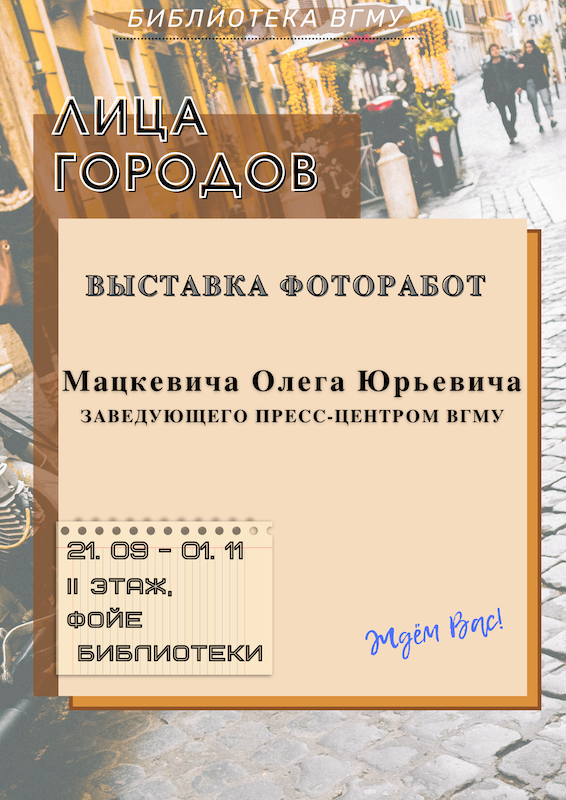 С 21 сентября в фотогалерее библиотеки смена экспозиции. Автор выставки «Лица городов» - Мацкевич Олег Юрьевич, заведующий Пресс-центром ВГМУ, предлагает вашему вниманию фотографические путевые заметки из туристических мини-путешествий по странам Европы. Фотоработы, в которых так четко передается особая атмосфера и настроение. Где, по сути, каждая страна, город или местечко имеет свое неповторимое лицо. Так давайте отправимся в путешествие вместе! Попробуем уловить те самые детали и черты, делающие облик любого места уникальным. В путь!