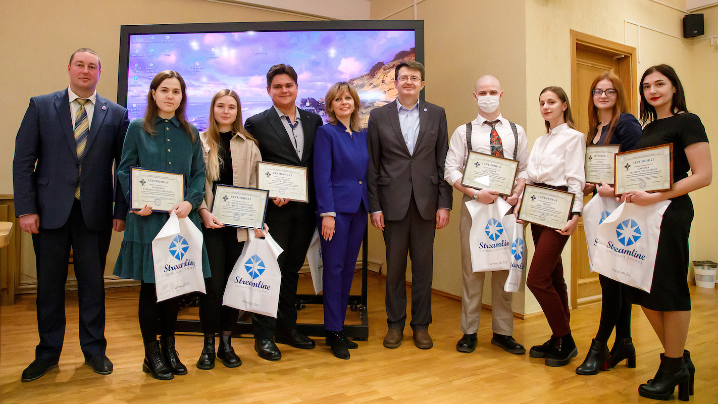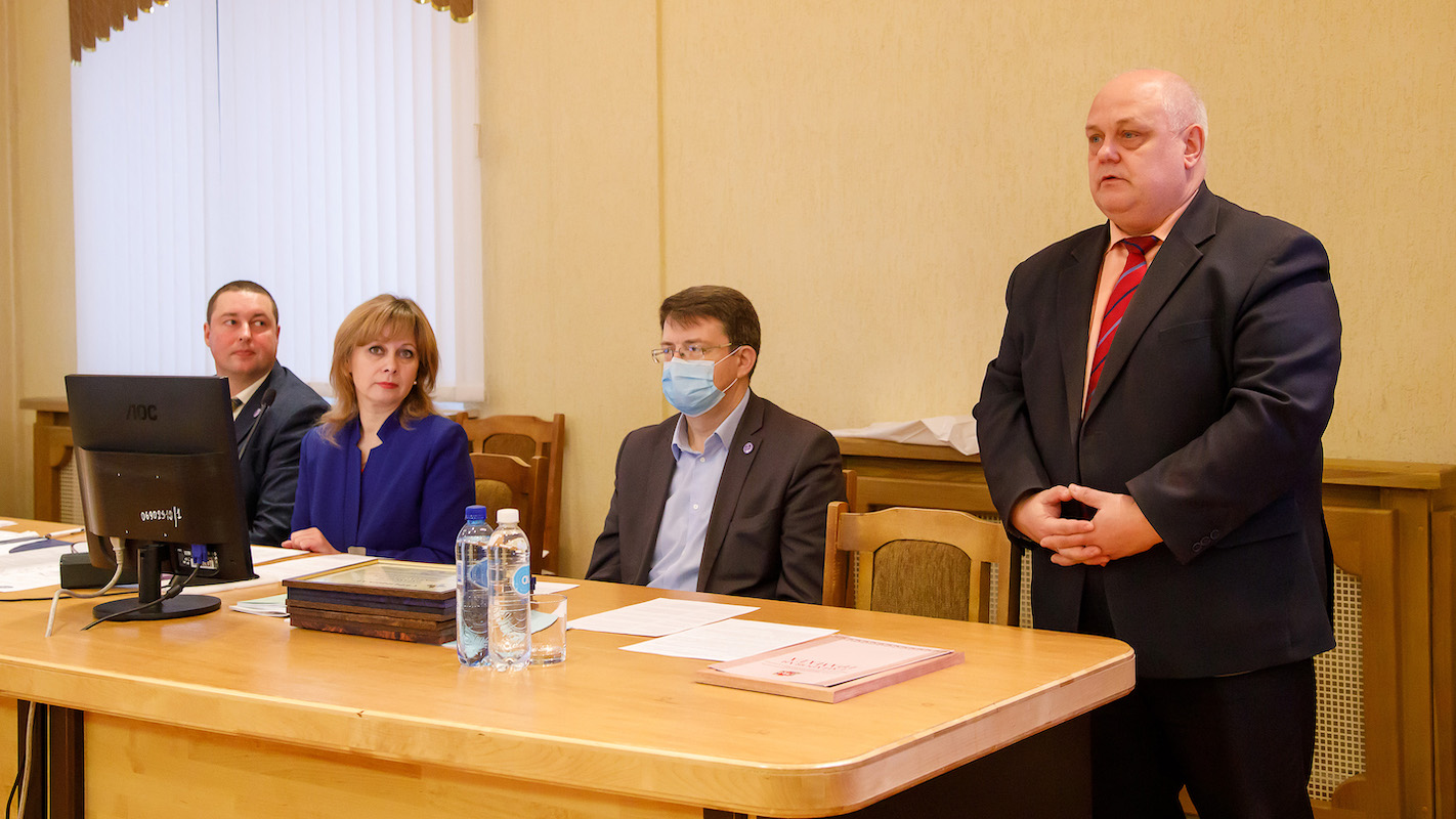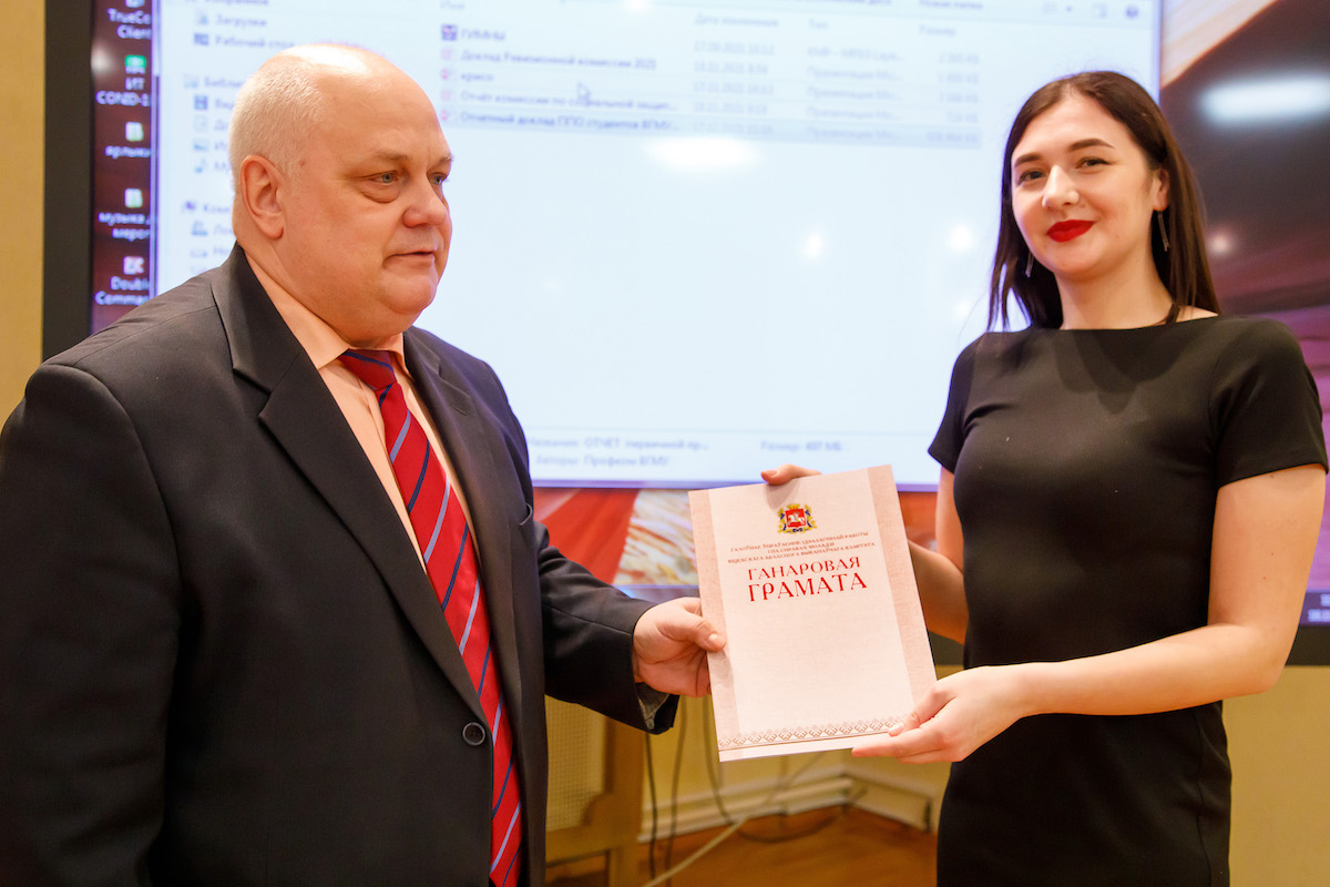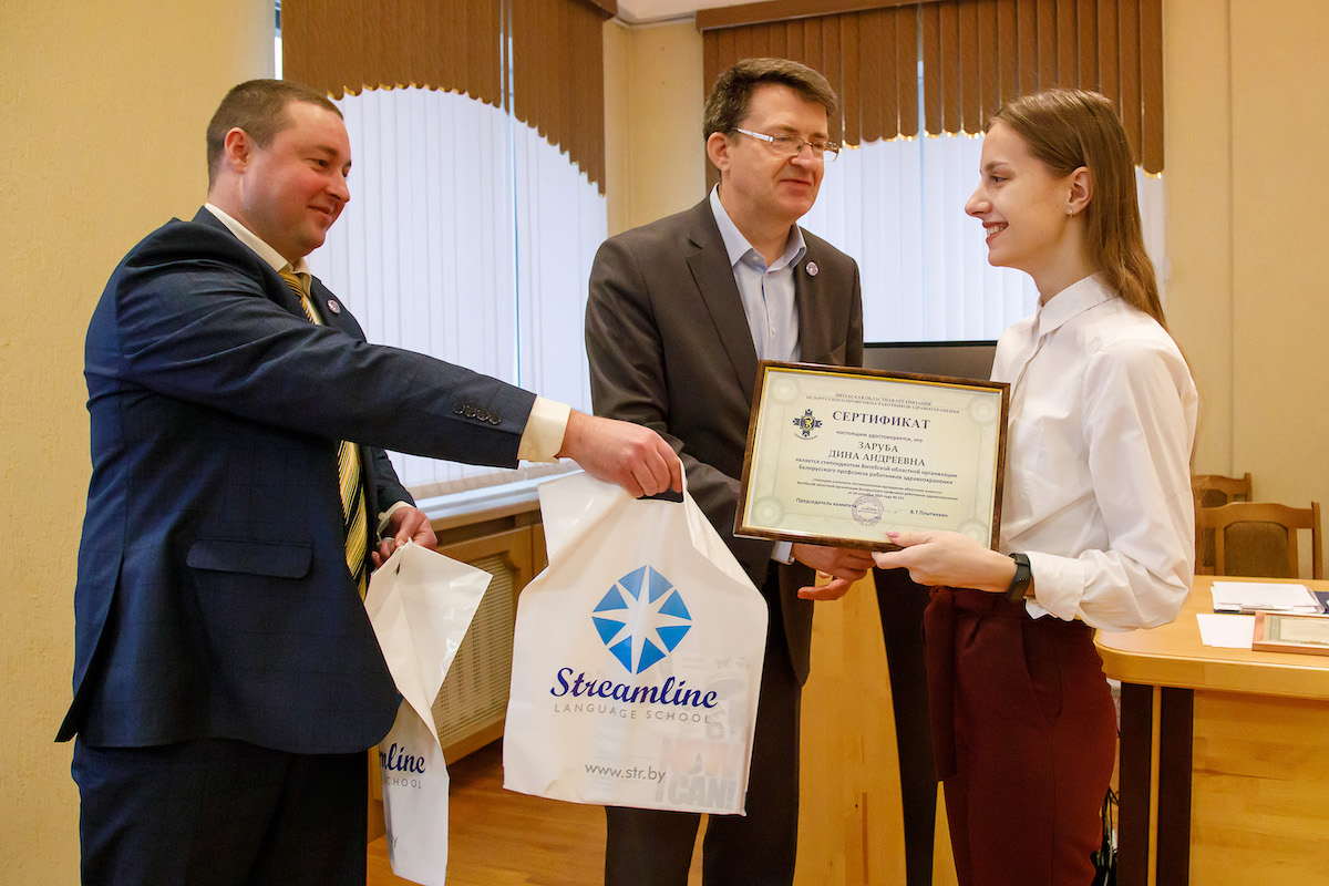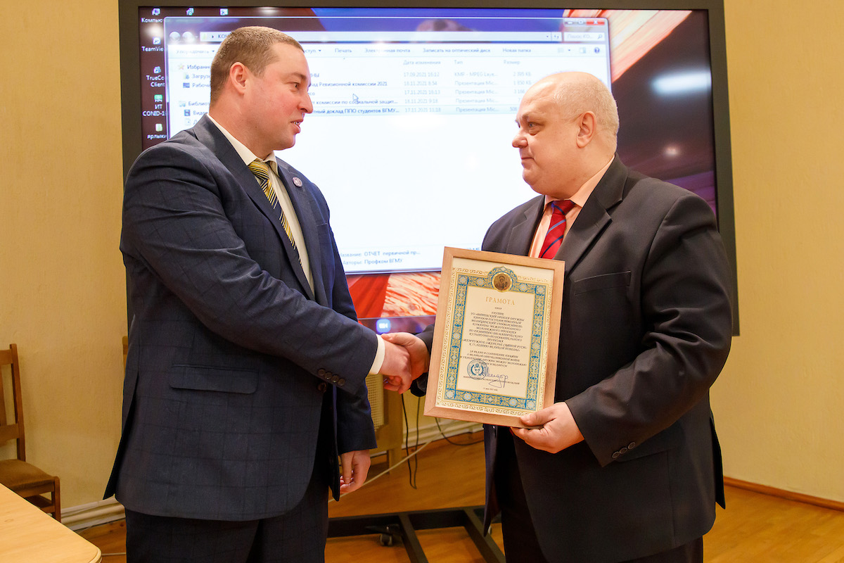 Далее слово было предоставлено Сергею Николаевичу Фадеенкову – главному специалисту Витебского областного исполнительно комитета. Сергей Николаевич выступил с наилучшими пожеланиями в будущей работе профсоюза студентов, подробно рассказав о совместном российско-белорусском проекте «Жемчужное ожерелье Святой Руси: к 75-летию Великой Победы», который выполняли с белорусской стороны 4 вуза Витебска и вручил грамоты за активное участие в проекте руководителю команды от ВГМУ Мясоедову Александру Михайловичу и студентке–активистке Павловой Полине Николаевне.