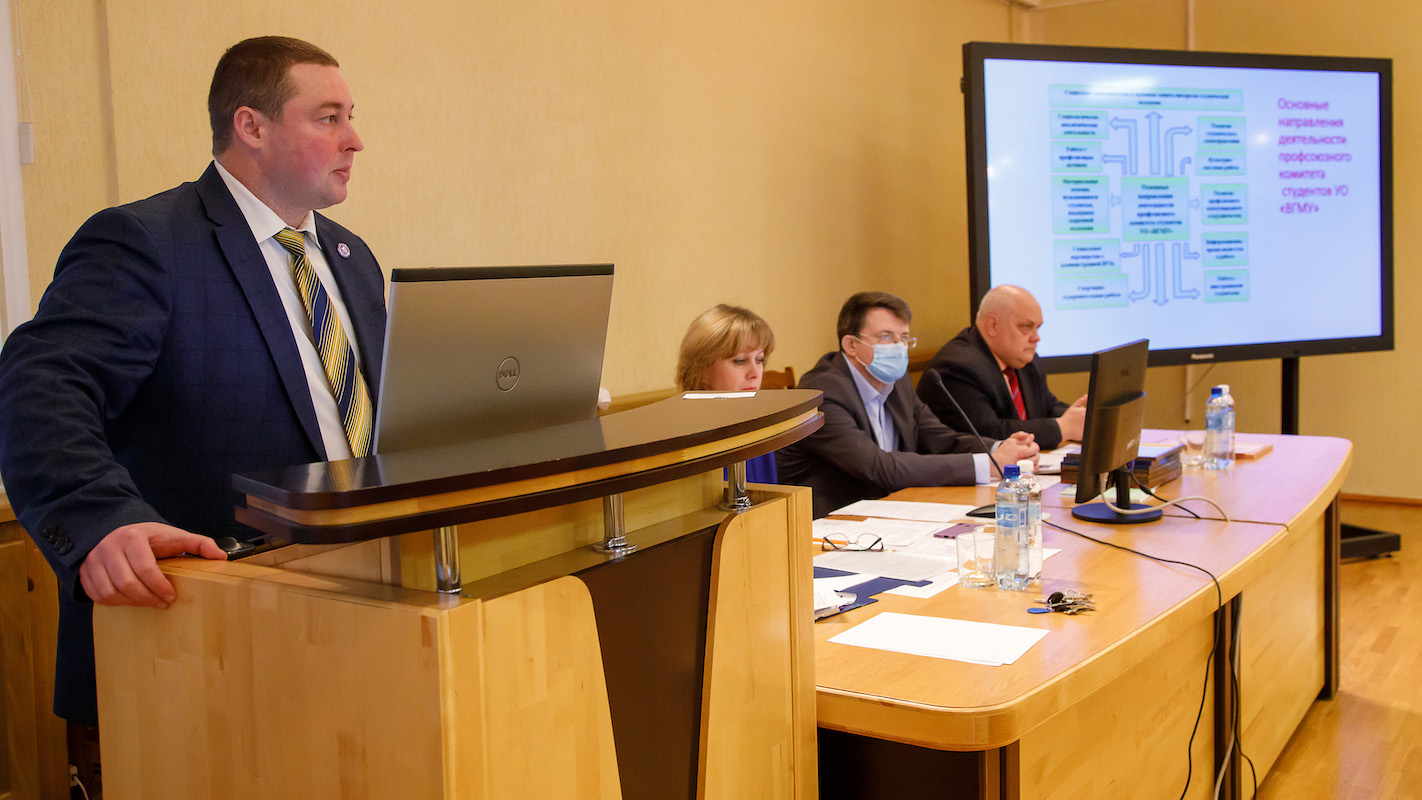 Вначале отчёт о работе ППО за период с 15.11.2019 по 17.11.2021 представил А.М. Мясоедов. Из доклада были видны основные аспекты работы: цель и основные направления работы первичной профсоюзной организации. На сегодняшний день структура включает 4 факультетских бюро, 310 профсоюзных групп, 11 комиссий профсоюзного комитета и 15 представителей руководящего органа профкома студентов.