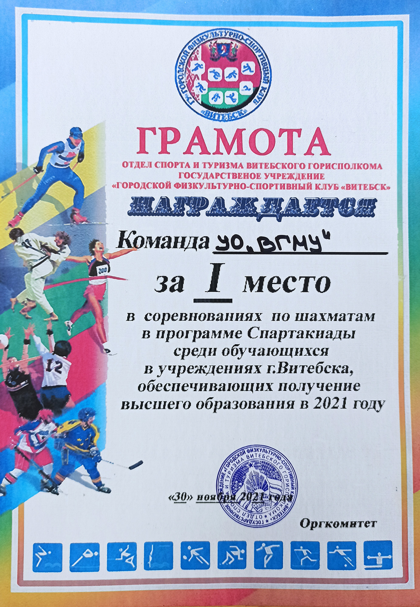 Команда университета заняла 1-е место в соревнованиях по шахматам в программе спартакиады учреждений высшего образования г. Витебска. Поздравляем наших студентов-спортсменов: Воротынского Владислава (6 курс лечебного факультета), Шуляковского Илью (3 курс лечебного факультета), Захаренко Илью (1 курс лечебного факультета), Оразмырадова Мейлиса (3 курс ФПИГ), Овезову Менгли (6 курс ФПИГ), Макаревич Марину (5 курс лечебного факультета) и тренера команды Аксенцова Александра Григорьевича, старшего преподавателя кафедры медицинской реабилитации и физической культуры с курсом ФПК и ПК, с очередной победой. Так держать ВГМУ!