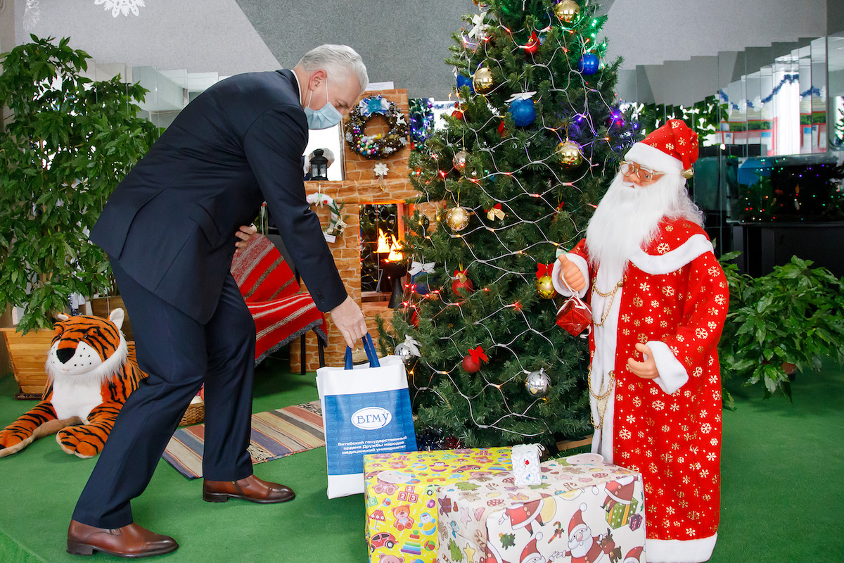 27 декабря в канун Нового года делегация студентов и сотрудников ВГМУ, возглавляемая ректором университета Анатолием Тадеушевичем Щастным, посетила Дом ребёнка, чтобы передать сертификат на сумму 3700 рублей главному врачу учреждения Мизеркиной Елене Геннадьевне. Стоит отметить, что в этот раз Дом ребёнка навестили вместе со своим деканом Асирян Еленой Геннадьевной и двое будущих врачей-педиатров: студенты 1 курса педиатрического факультета Шутов Артём и Барилко Татьяна. Это положило начало сотрудничеству студентов и преподавателей нового факультета университета с этим детским учреждением здравоохранения.