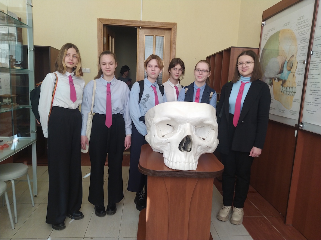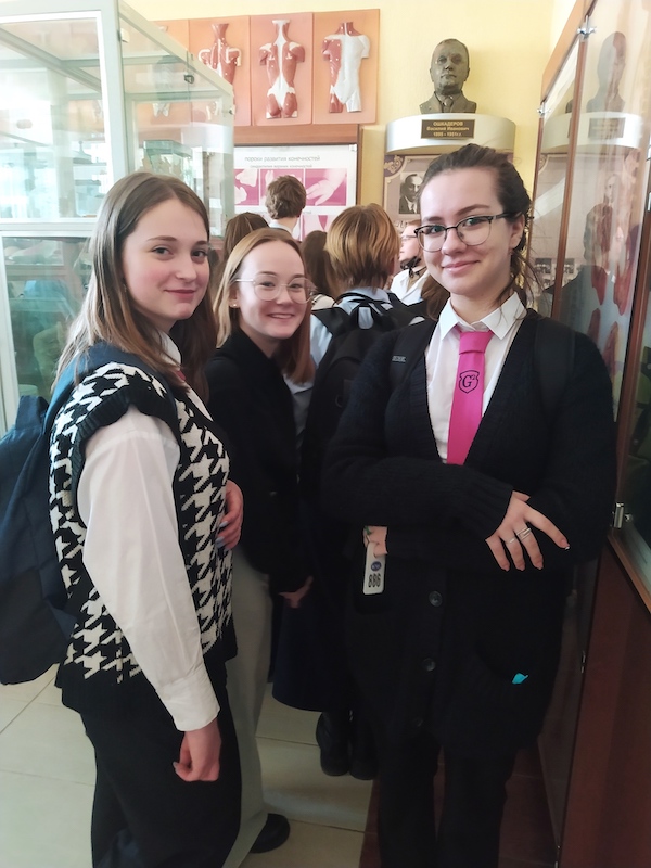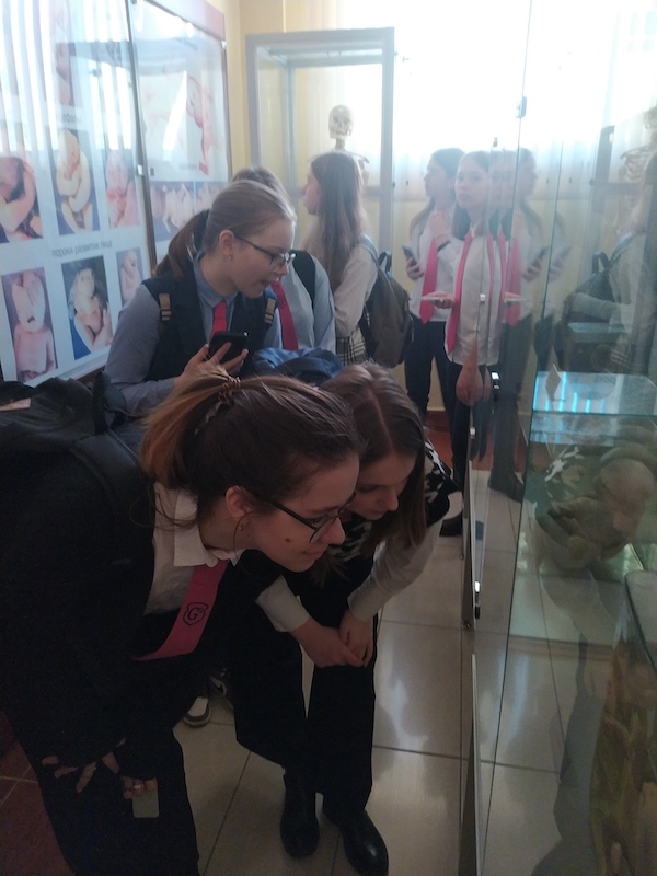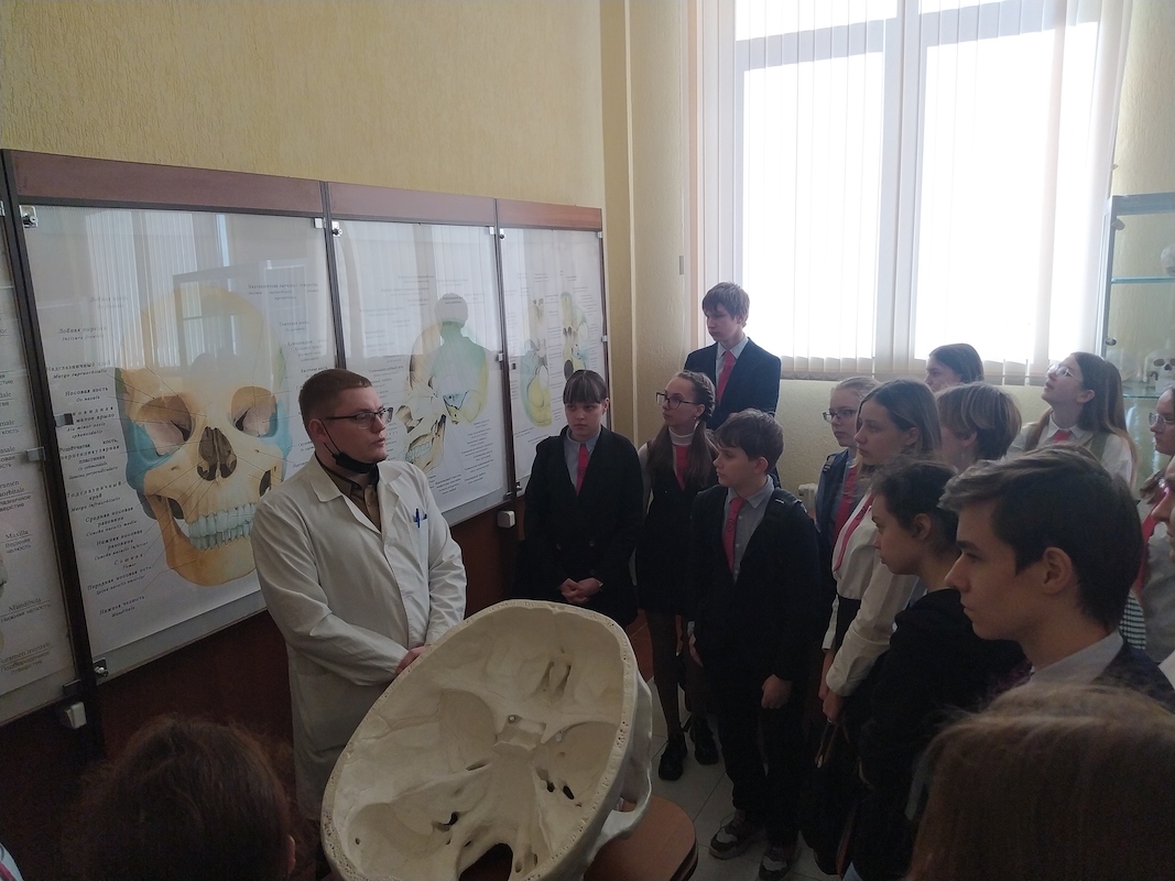 Продвигаясь по коридорам университета мы побывали на кафедрах фарматевтического факультета, вместе с заведующей кафедрой общей физической и коллоидной химии З.С.Кунцевич побывали на занятиях у студентов лечебного факультета и факультета подготовки иностранных граждан. Знакомясь с нашим университетом, нельзя не посетить кафедру анатомии с анатомическим музеем, который вызвал огромный интерес у будущих студентов, оставил неизгладимое впечатление.