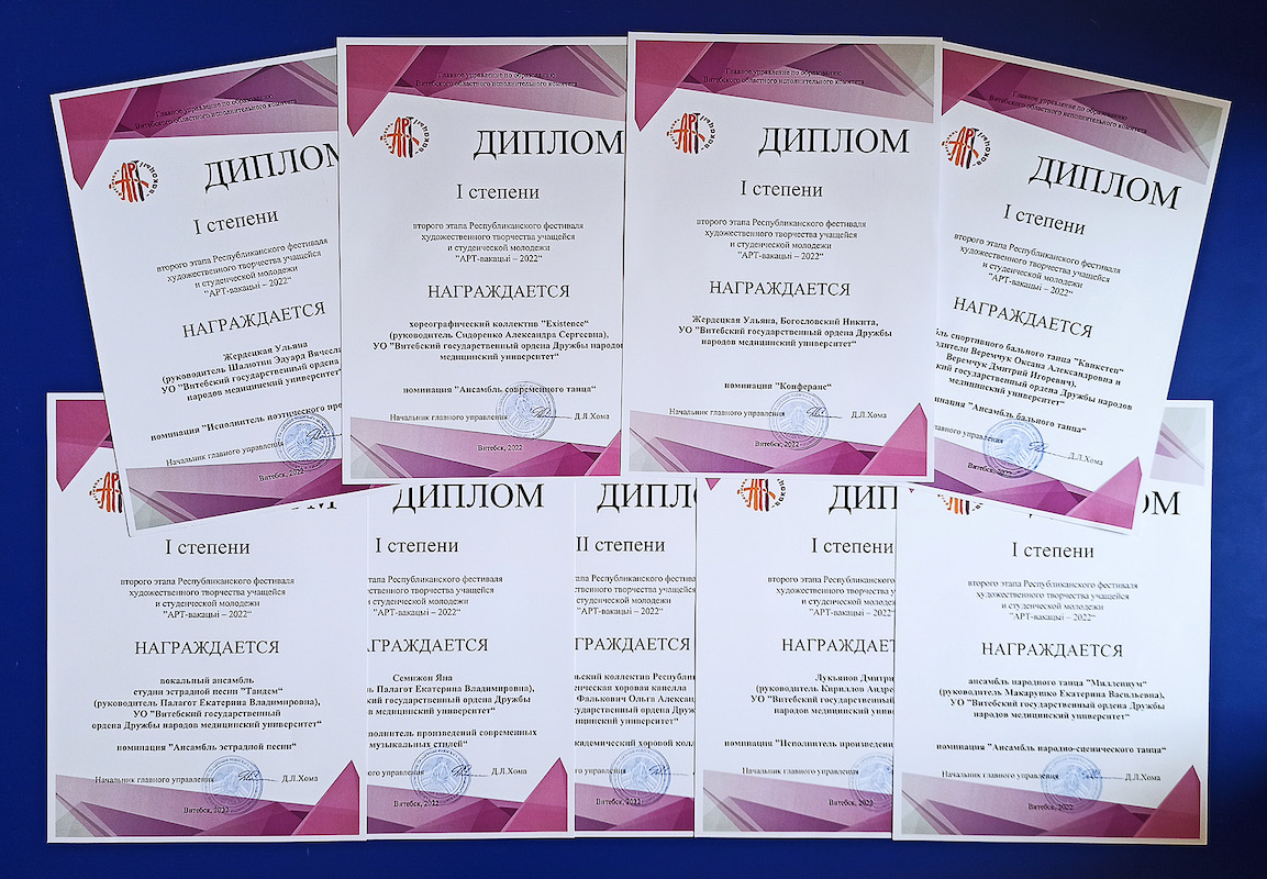 Результатом выступления участников творческих коллективов и исполнителей студенческого клуба Витебского государственного медицинского университета стали 8 дипломов I степени и 1 диплом II степени.
