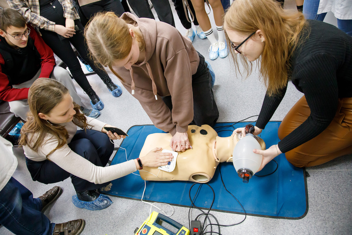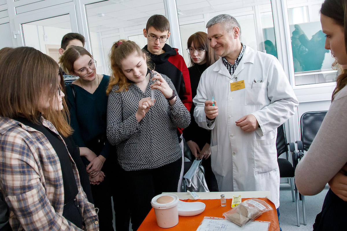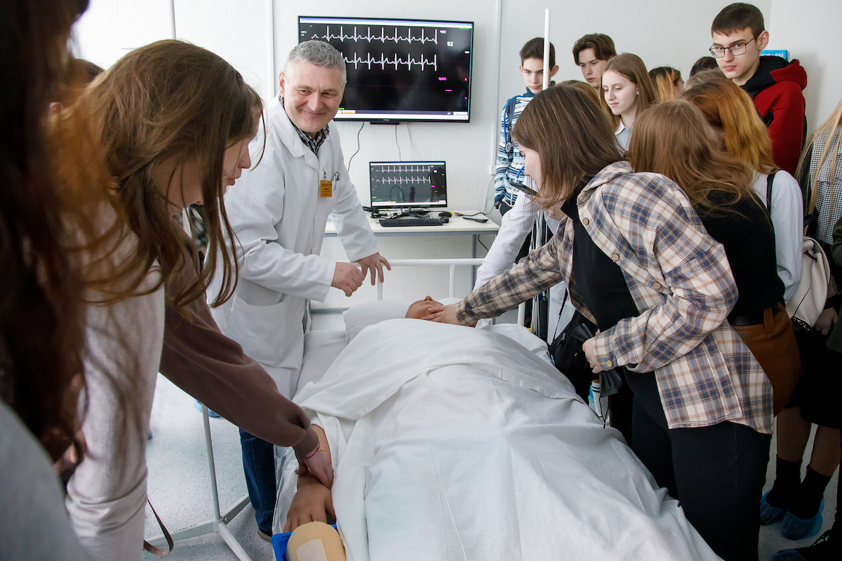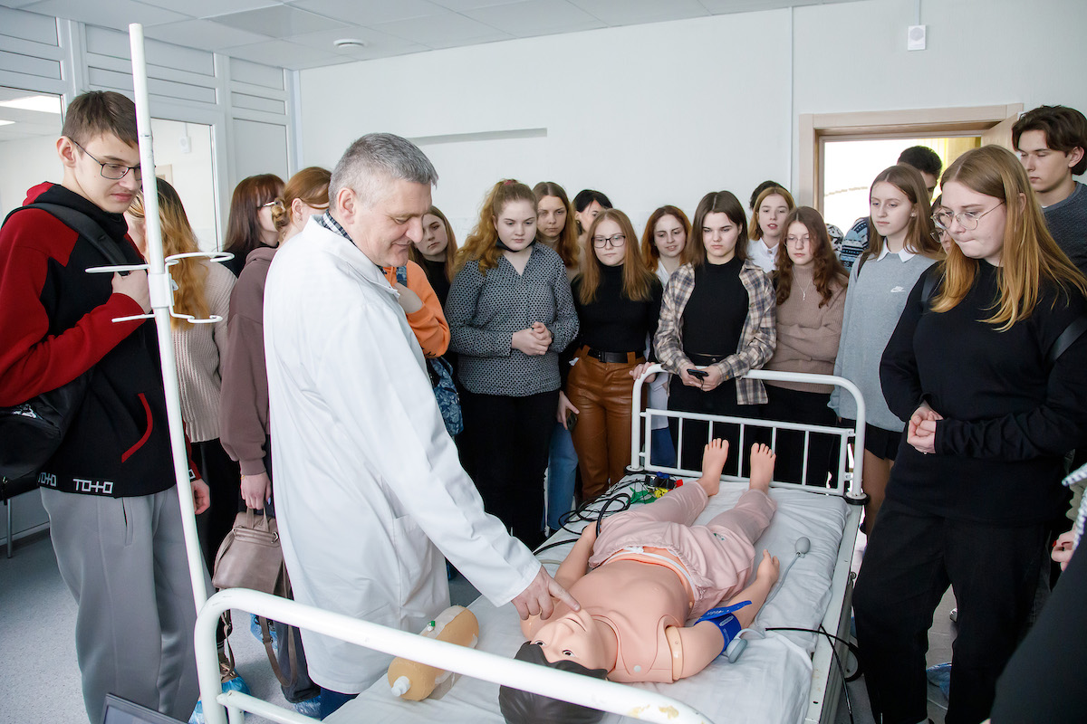 Далее учащиеся посетили учебный центр практической подготовки и симуляционного обучения. Здесь под руководством начальника центра Редненко Виктора Валентиновича ребята смогли применить полученные знания по медицинской подготовке на практике и отработать навыки оказания первой помощи: непрямой массаж сердца и искусственное дыхание. Школьники узнали о наличии множества способов введения лекарственных веществ, и, даже, некоторые из них попробовали практически. Виктор Валентинович очень интересно рассказал об истории создания тренажеров, доступно и подробно охарактеризовал возможности каждого из них, ознакомил с практическими навыками, которые сдают наши студенты. Ребята также смогли почувствовать себя настоящими хирургами при проведении лапараскопической операции на тренажере.