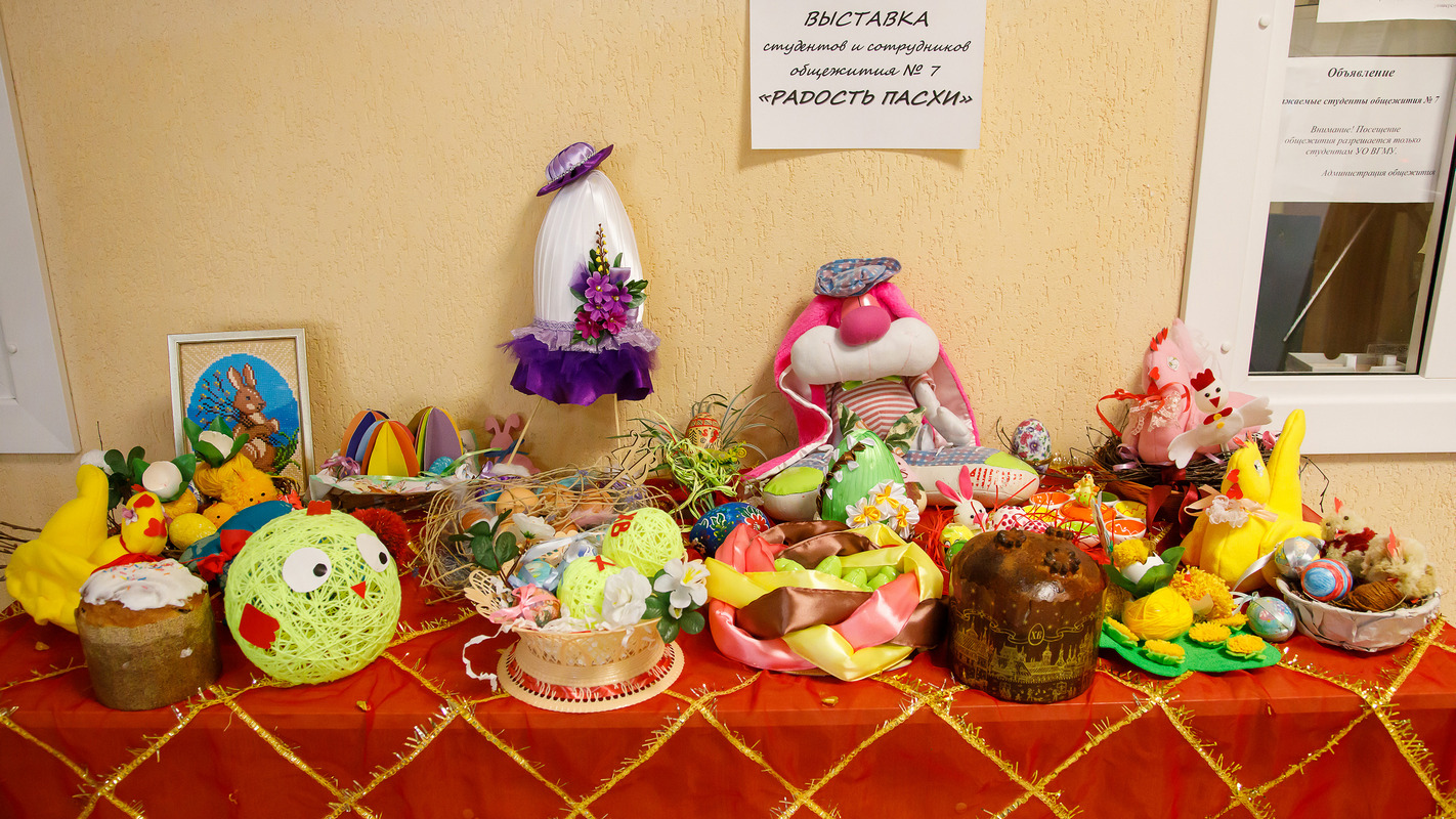 С 15 апреля по 24 апреля в нашем общежитии прошла традиционная выставка творческих работ "Радость Пасхи»", активные участники которой – студенты и сотрудники общежития. Все с удовольствием мастерили различные поделки и расписывали красками яйца, проявив необыкновенную фантазию и выдумку. Каждый, кто побывал в общежитии, смог увидеть символ праздника – пасхальное расписное яйцо более метра высотой.