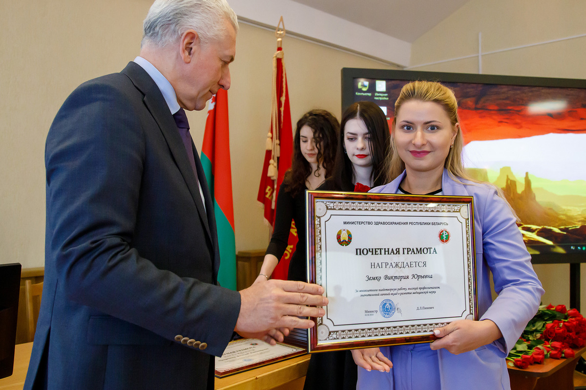 За многолетнюю плодотворную работу, высокий профессионализм, значительный личный вклад в развитие медицинской науки награждены Почетной грамотой Министерства здравоохранения Республики Беларусь Земко Виктория Юрьевна и Прищепенко Вячеслав Александрович.