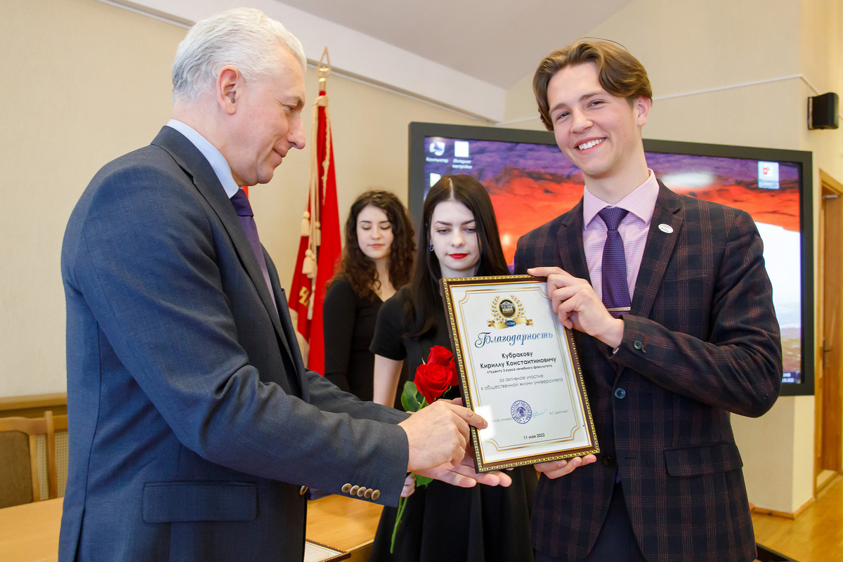 Благодарность ректора за высокий профессионализм, большой личный вклад в развитие студенческой науки объявлена председателю СНО Рыхловой Анастасии Александровне. Студенту 3 курса лечебного факультета Кубракову Кириллу Константиновичу также объявлена благодарность ректора за отличную учебу и активное участие в общественной жизни университета