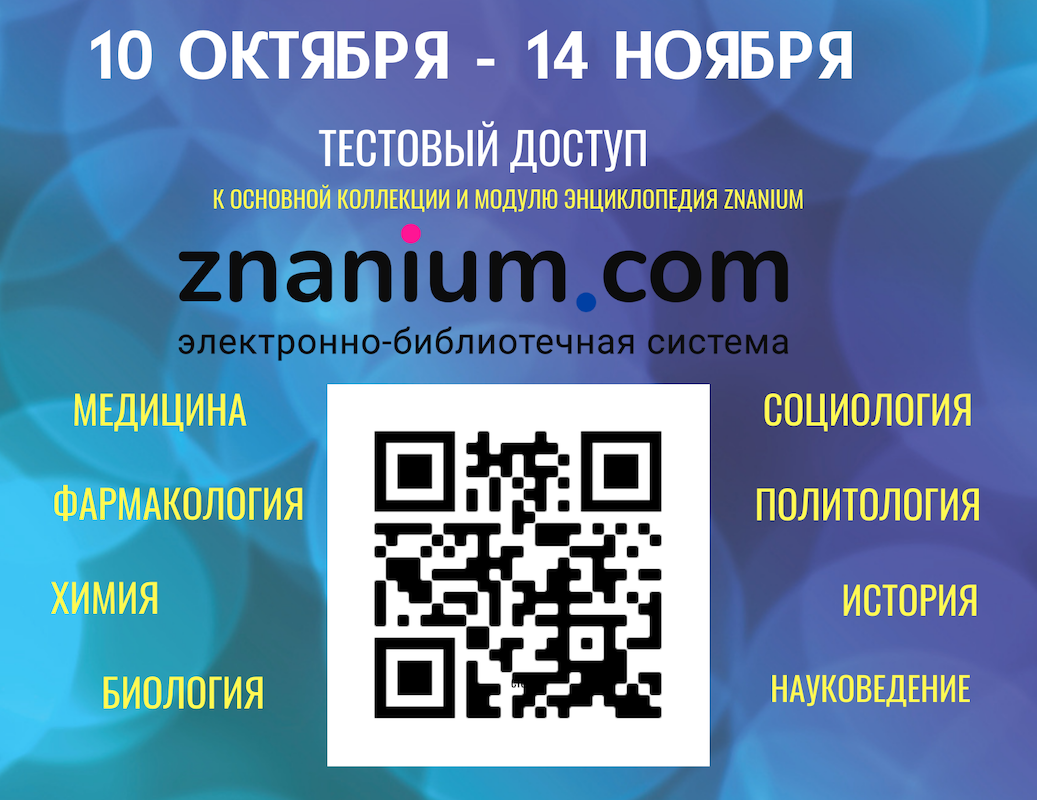 С 10 октября (понедельник) до 14 ноября (понедельник) в течение месяца будет открыт тестовый доступ к основной коллеции ЭБС Znanium компании Инфра-М (50 000 учебников и учебных пособий) и модулю Энциклопедия Znanium (более 183 000 статей).