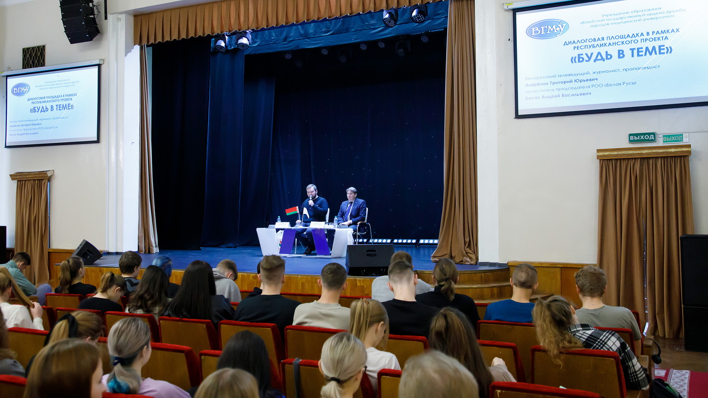 18 октября 2022 года в 11.00 в актовом зале университета состоялась диалоговая площадка в рамках республиканского проекта «Будь в теме» с участием белорусского телеведущего, журналиста, пропагандиста Азарёнка Г.Ю. и заместителя председателя РОО «Белая Русь» Басака А.В. Студентам и сотрудникам ВГМУ была предоставлена возможность задать вопросы спикерам диалоговой площадки, которые, в свою очередь, отвечали на них, подтверждая примерами из истории и реальных событий современности.