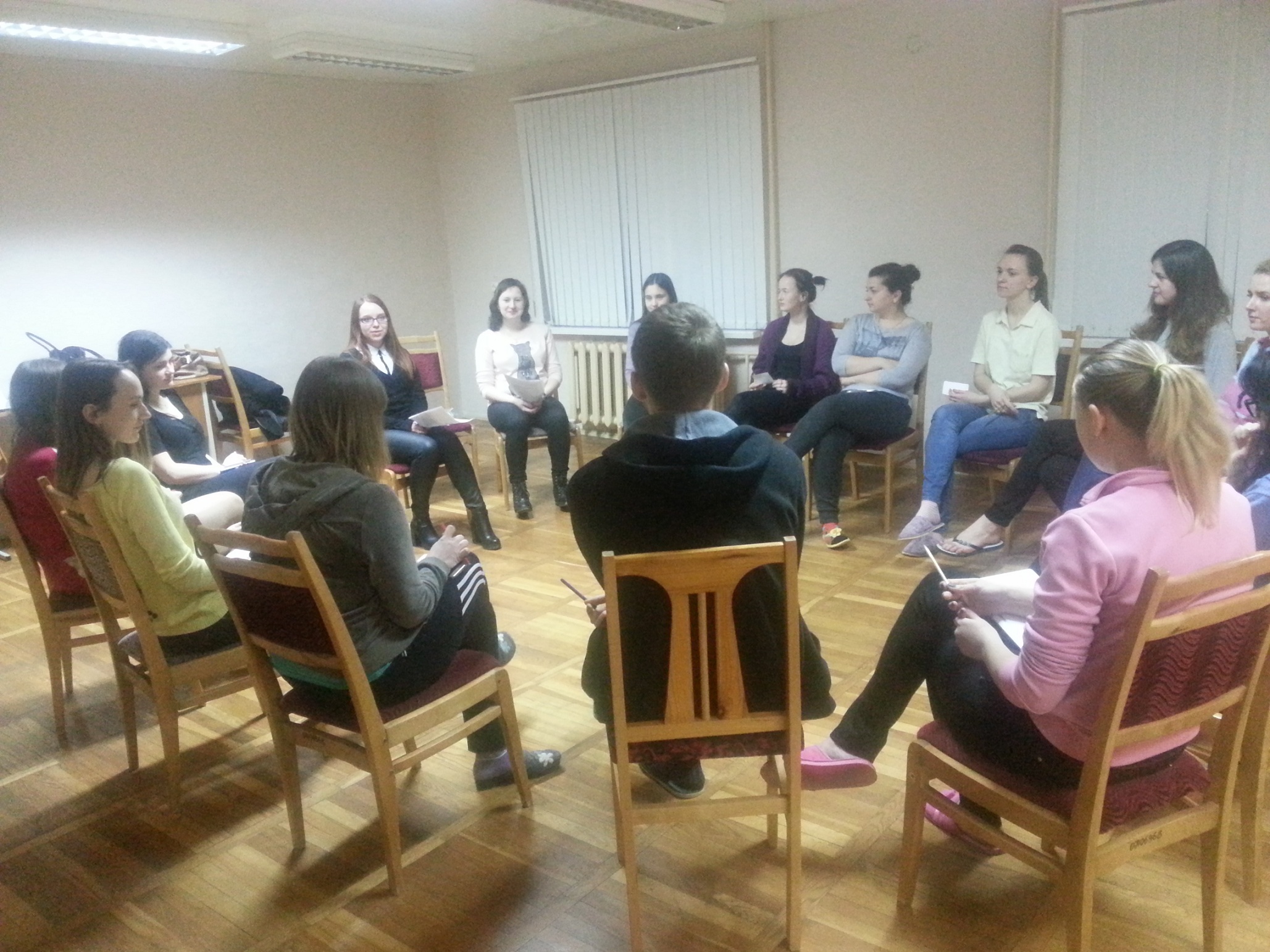 22 марта в общежитии №2 в рамках работы КО «Моя семья» прошел социально-психологический тренинг на тему «Образ «Я», который провели выпускницы факультета социальной педагогики и психологии ВГУ имени П.М. Машерова Филиппенко Дарья и Каминская Надежда.