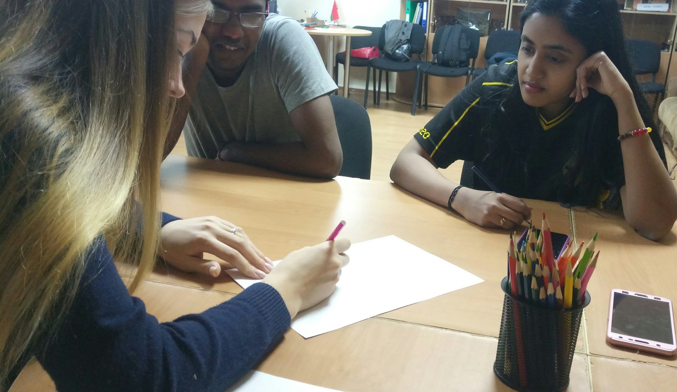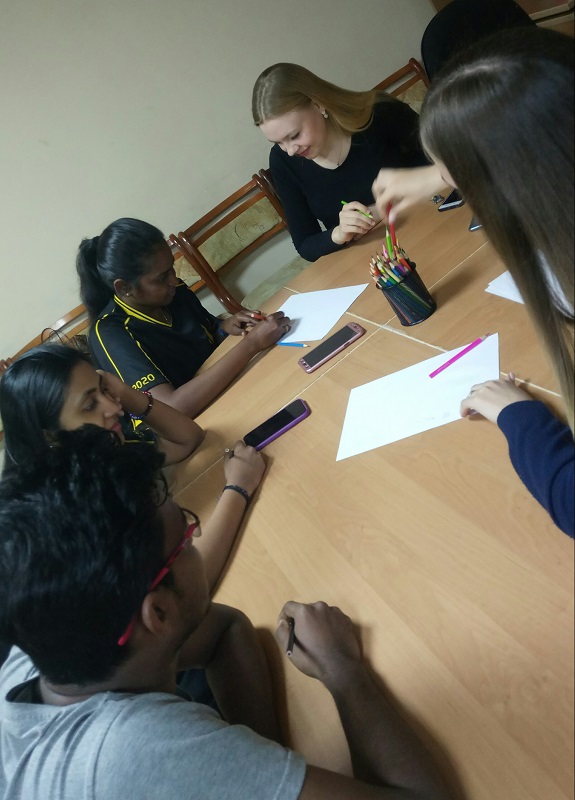 Участники попробовали общаться без слов, используя только цветные карандаши и листы бумаги, а также назначить друг другу встречу лишь с помощью жестов. Студенты с энтузиазмом брались за задания, смогли наладить контакт и понять друг друга.
