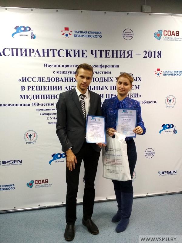 Свои научные исследования в г. Самара представили аспиранты нашего ВУЗа - Земко Виктория Юрьевна, кафедра анестезиологии и реаниматологии с курсом ФПК и Прищепенко Вячеслав Александрович, кафедра пропедевтики внутренних болезней. Работы были отмечены дипломами и памятными подарками.