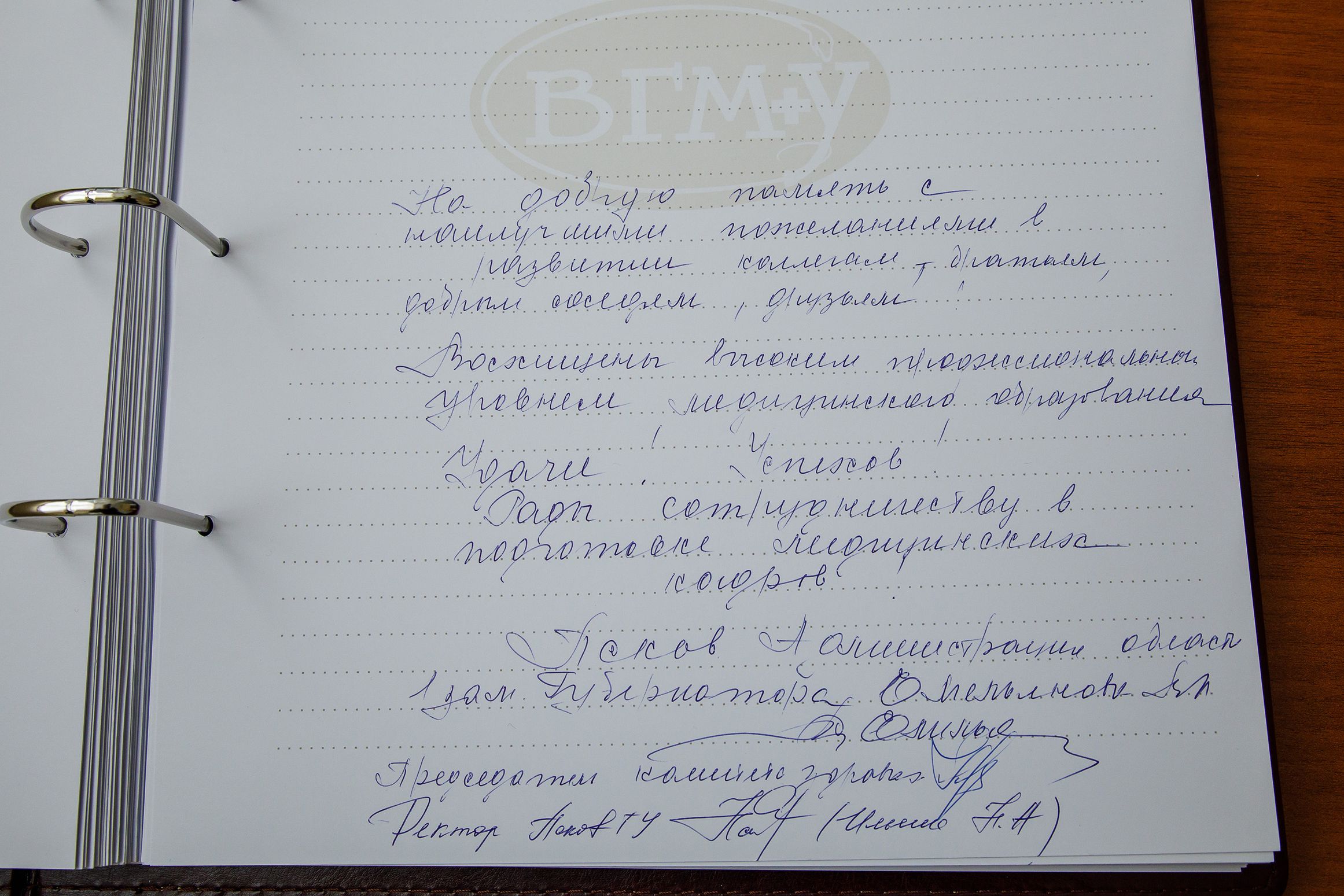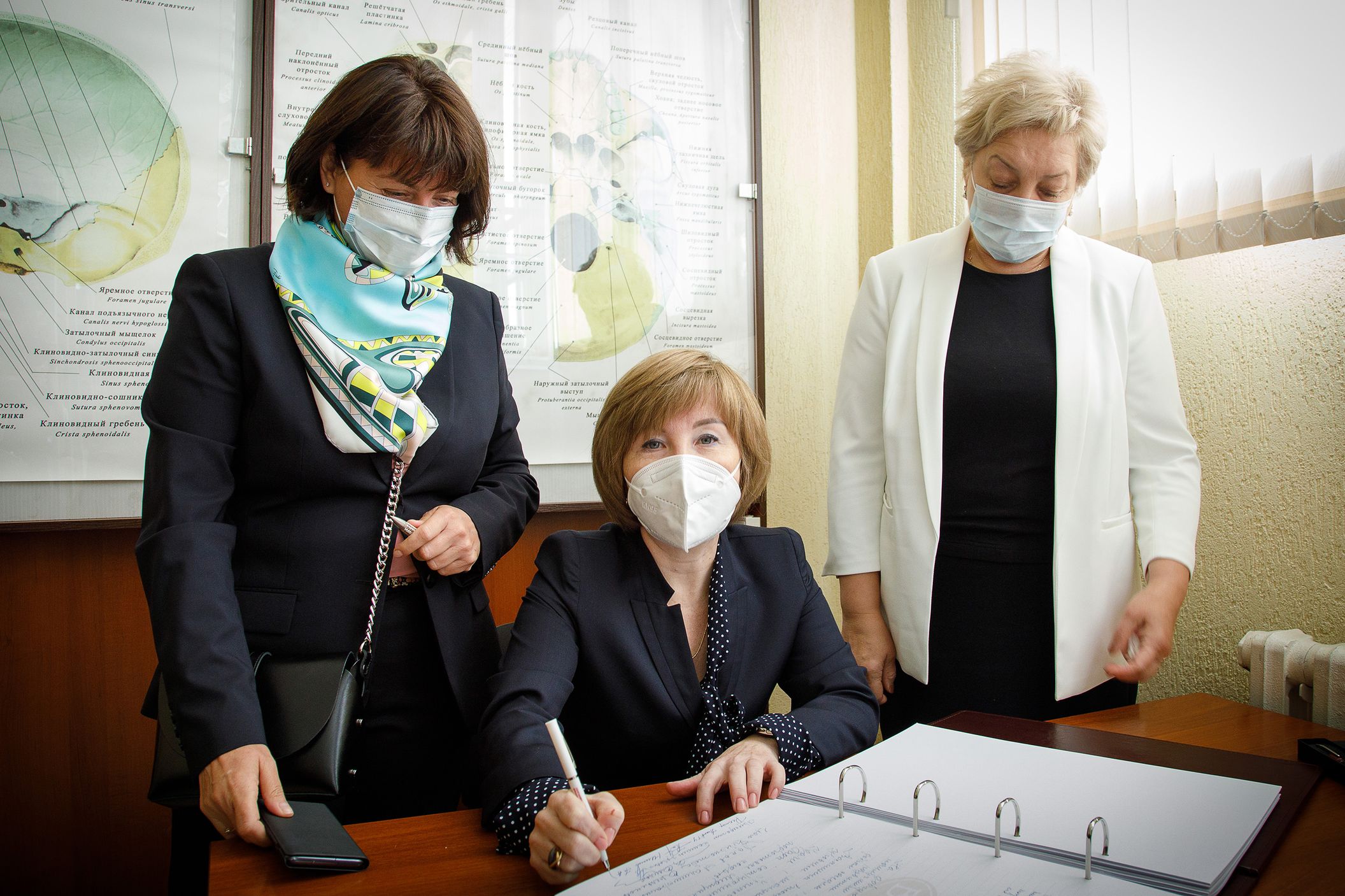 25 сентября 2020г. ВГМУ посетила делегация Псковской области во главе с Первым заместителем Губернатора Псковской области В.В.Емельяновой. Гости познакомились с организацией учебного процесса университета, материально-технической базой, посетили кафедры анатомии человека, топографической анатомии и оперативной хирургии, клинической микробиологии. Первый заместитель Губернатора Псковской области В.В.Емельянова, председатель Комитета по здравоохранению Псковской области М.В.Гаращенко и ректор Псковского государственного университета Н.А. Ильина оставили отзыв в книге Почетных гостей. В рамках визита обсуждались вопросы перспектив сотрудничества, а также был подписан Меморандум о взаимопонимании между ВГМУ и Псковским ГУ.