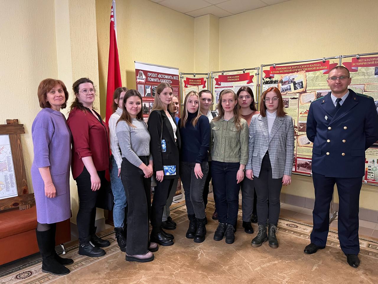 21.02.2023 ассистент кафедры организации и экономики фармации с курсом ФПК и ПК И.А. Васильчук и студенты 3 курса фармацевтического факультета посетили выставку по материалам расследования Генеральной прокуратуры Республики Беларусь уголовного дела о фактах геноцида белорусского народа в годы Великой Отечественной войны, которая размещается в прокуратуре г. Витебска. Экскурсию провел заместитель начальника военного отдела прокуратуры Витебской области Полуянчик Владимир Александрович.