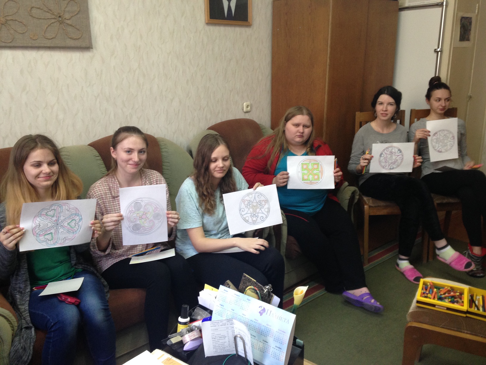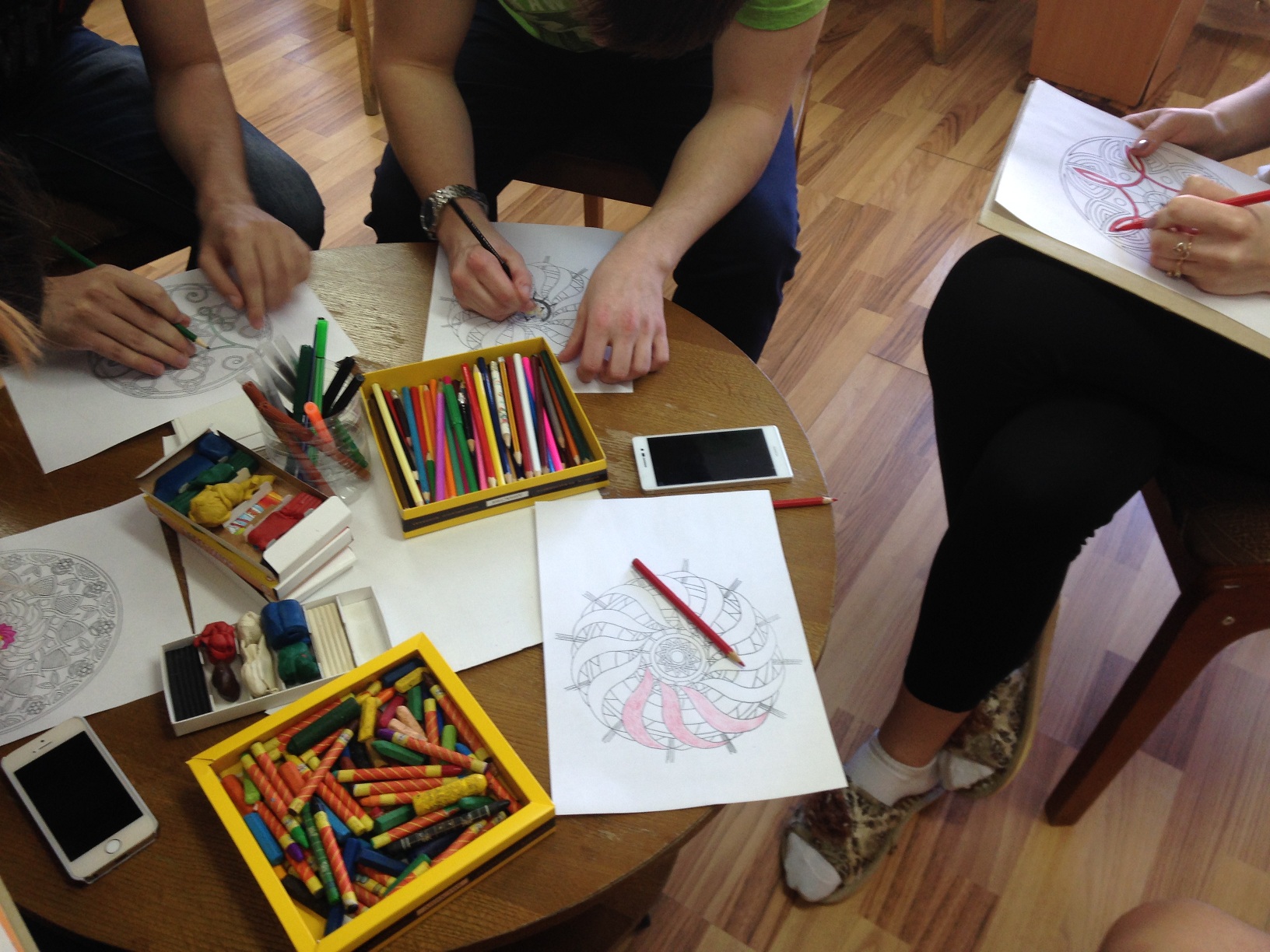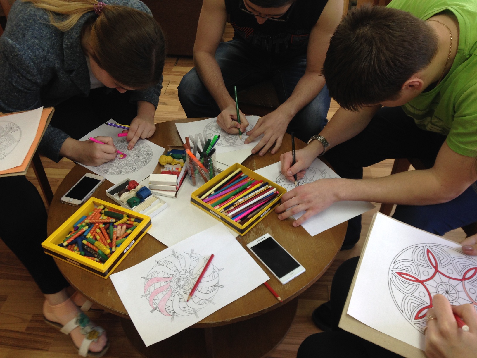 Для исследования межличностных взаимоотношений и конфликтов ребятам было представлено упражнение «Рисование с партнером». Задача состояла в том, чтобы пообщаться с партнером с помощью линий, форм и цвета. Далее педагоги-психологи познакомили студентов с таким методом арт-терапии как мандала-терапия. Сама идея арт-терапии и диагностика методом мандала принадлежит швейцарскому психиатру, основоположнику одного из направлений аналитической психологии Карлу Гюставу Юнгу. В конце занятия для исследования ценностных ориентаций, взаимоотношений, сотрудничества и соперничества членов группы было предложено упражнение «Сотворение мира». С закрытыми глазами ребята создавали из пластилина скульптуру, выражающую мысли и чувства возникающие в процессе лепки. Затем совместно с группой с открытыми глазами структурировали «целостный мир» из получившихся скульптур... В заключение участники поделились своими впечатлениями и положительными эмоциями!