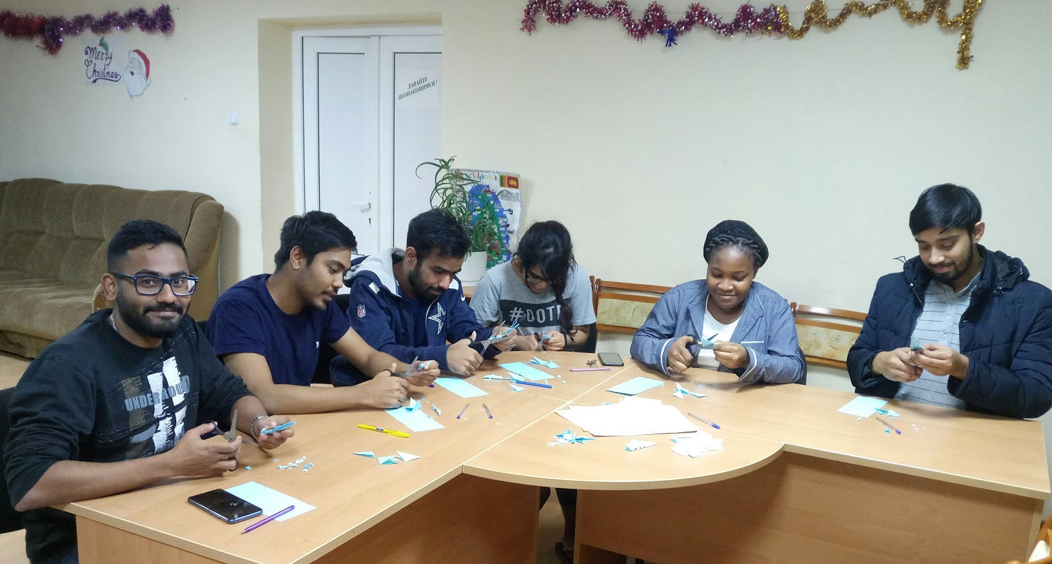 27 декабря в общежитии №1 прошло праздничное мероприятие с иностранными студентами. Участники подвели итоги уходящего года, вспомнили хорошие и радостные моменты, случившиеся с ними. Затем, имея схожую инструкцию, студенты вырезали снежинки, которые у каждого участника получились разные. Это был наглядный пример того, что каждый из нас по-своему уникален и неповторим, как и узоры снежинок, произведенные природой.