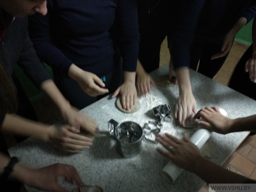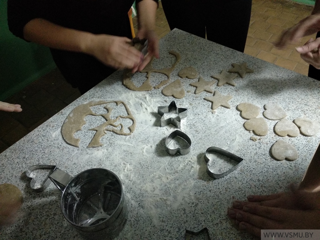 А было это так: 13 декабря на кухне второго этажа во втором общежитии, в гостях у воспитателя Шеповаловой С.В и сотрудников СППС Михлюк В.И. и Сыродоевой Е.М. собрались участники КО «Моя семья» для того, чтоб поговорить об истории празднования Нового Года в разных странах, познакомиться с традицией украшать елки печеньем, пряниками, конфетами, яблоками и прочей снедью, познакомиться с удивительной техникой подведения итогов года «Елочка» и ….Своими руками испечь новогодние украшения!