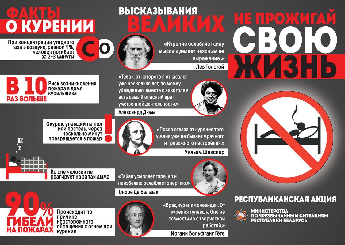 Курение в постели – одна из основных причин пожаров в Республике Беларусь. В период с 8 по 28 ноября пройдет республиканская акция «Не прожигай свою жизнь!», с целью предупреждения пожаров и гибели людей от них по причине неосторожного обращения с огнем при курении.